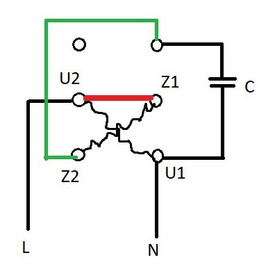 Abban bíztam, hogy nem kell majd teljes részletességgel leírnom ez a bekötést, mert értelem szerű lesz számodra. Te írtad bele a rajzodba a motor tekercsek kivezetésinek az elnevezését, ebből következett a hiányzó "Z2" ami egy áthidalással össze van kötve az "U1" ponttal. Ha jól megfigyeled a bekötést, akkor neked a betáp egyik pontja a "Z2"-re van kötve amit át kell kötni az "U1" pontra és meg kell ott szüntetni az átkötést. A másik átkötés is megszűnik ami a "Z1" pontról a kondenzátorok egyik összekötött közös pontja a kapocslécen. Ez az átkötés kell a "Z1"-"U2" közé (pirossal jelölve)! A kondenzátorok szabadon maradt közös pontját kell összekötni a "Z2" ponttal (zöld színnel jelölve) egy vezeték darabbal ahogyan azt leírtam. Bízom benne, hogy meg tudod ezt csinálni helyesen.