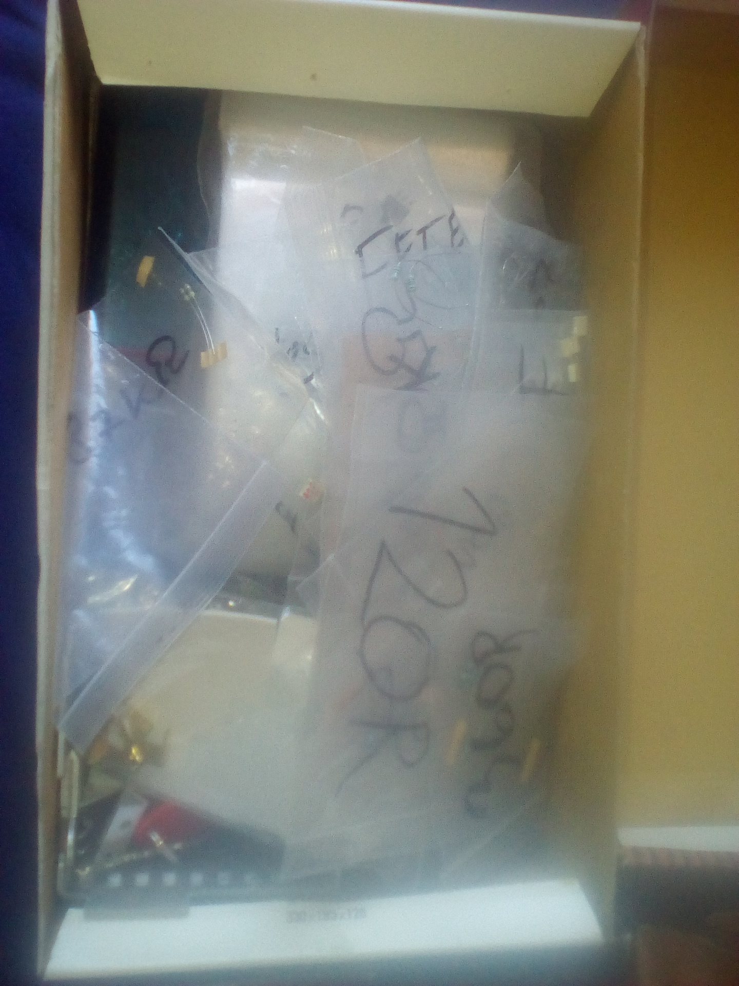 - doboz 1: bontott és új alkatrészek. Egy része szétválogatva, bezacskózva. De van egy kis doboznyi félvezető is benne ömlesztve (tranzisztor, zener, fetek)