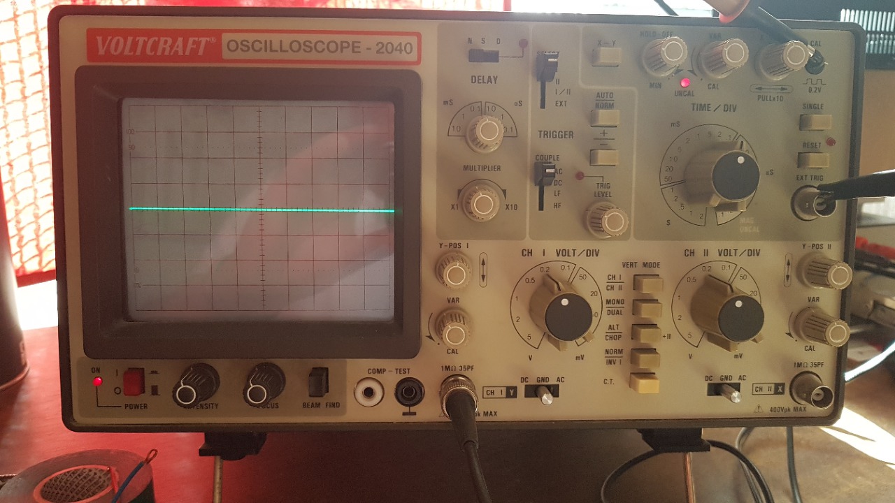 Kapcsold a bemeneti AC/DC kapcsolókat GND állásba, csavargasd a bemeneti osztókat, a legérzékenyebb állásban (5mV) is csak egy vízszintes egyenes vonalat kellene látnod mindkét csatornán.