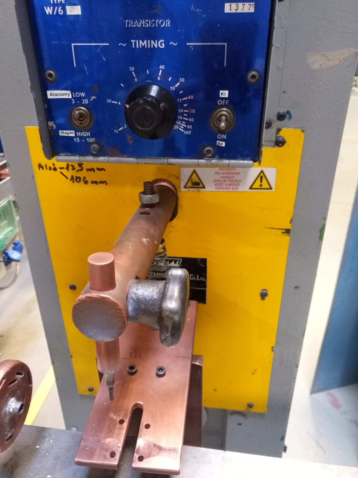 Középen az a fekete egy programozható és kézzel állítható időzítő. (hegesztési idő) Csavarhúzóval beállítható a tartomány...akár a másodperc törtrésze is, és az átlátszó tekerentyűvel állítod a hosszabb-rövidebb hegesztőáram időt.