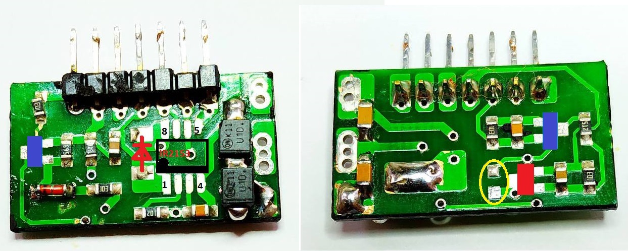 Akkor próbáld szétszedni a modult, sokat már nem vesztesz vele. Ha nem menthető az IR2153, akkor venni kell, és meg kell csinálni a modul klónját. A nyák tervezésben tudunk segíteni.