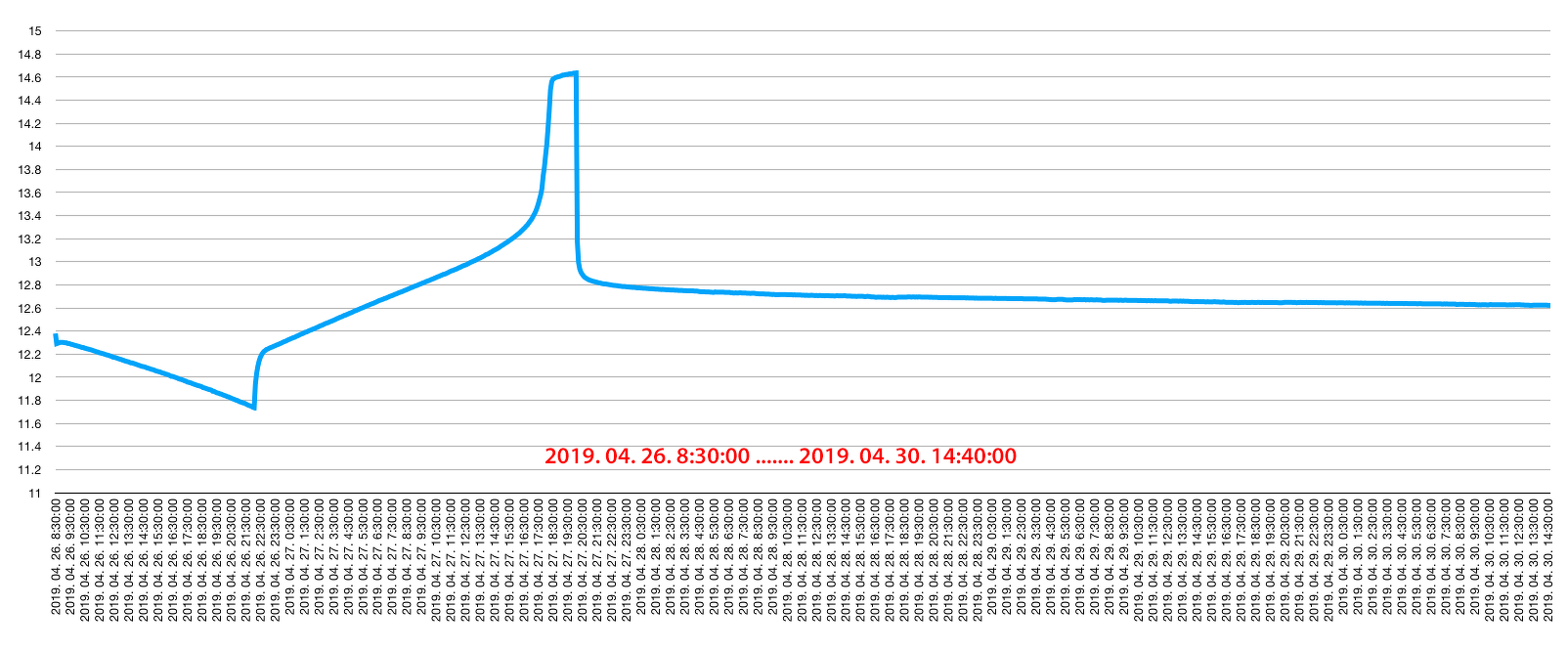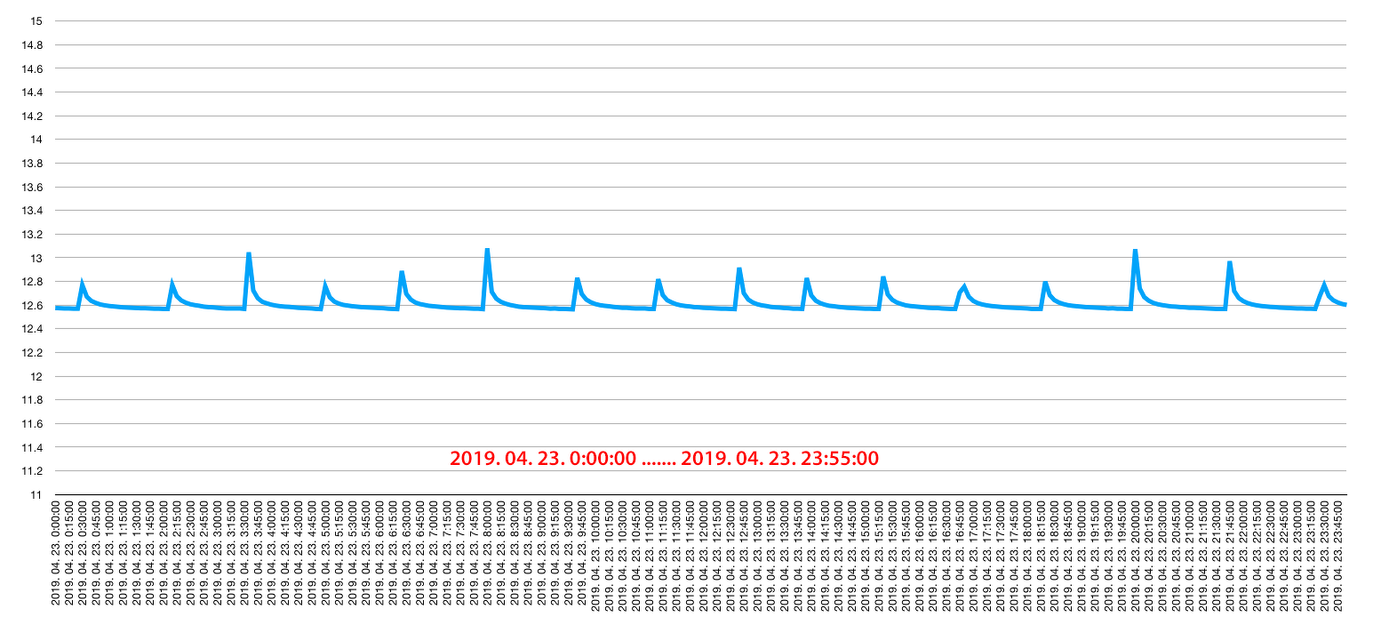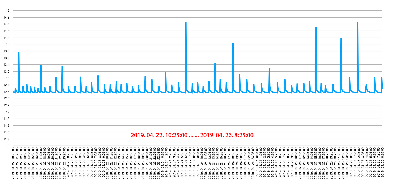 Ólom-savas munkaakkuk, 2 x 100 Ah (ellenőrizve mindkettő, 10 A-es konstans kisütőárammal), párhuzamosan kötve. Folyamatos fogyasztás kb. 50 mA, akkunként 25 mA, ezt is külön megmértem. Ennek ellenére a töltő naponta többször is tölti. Papíron 12.56 V vagy kevesebb feszültség alatt kapcsol be a töltés, 14.6 V-nál kikapcsol. A töltő 5 A-rel tölti a két akkumulátort, tehát egy akkura 2.5 A jut töltés közben. Lásd első és második kép. Viszont! Ha lemerítem a csomagot, a feltöltés után napokig igen-igen lassan csökken a feszültség, lásd harmadik kép. Egy ilyen merítés után a töltések közötti idő szépen fokozatosan csökken, kb. két hónap alatt elér a már ecsetelt állapothoz, napi kb. 15-szöri töltéshez. Miért? A fogyasztás nem indokolja. Előre is köszönöm! Egy apró magyarázat az ábrákhoz: a mérésadatgyűjtő minden ötödik percben mentette az adatokat, ezért ennyire változatosak a töltési végfeszültségek az első és második grafikonon. Minden "felugrás" egy töltési ciklust jelent.