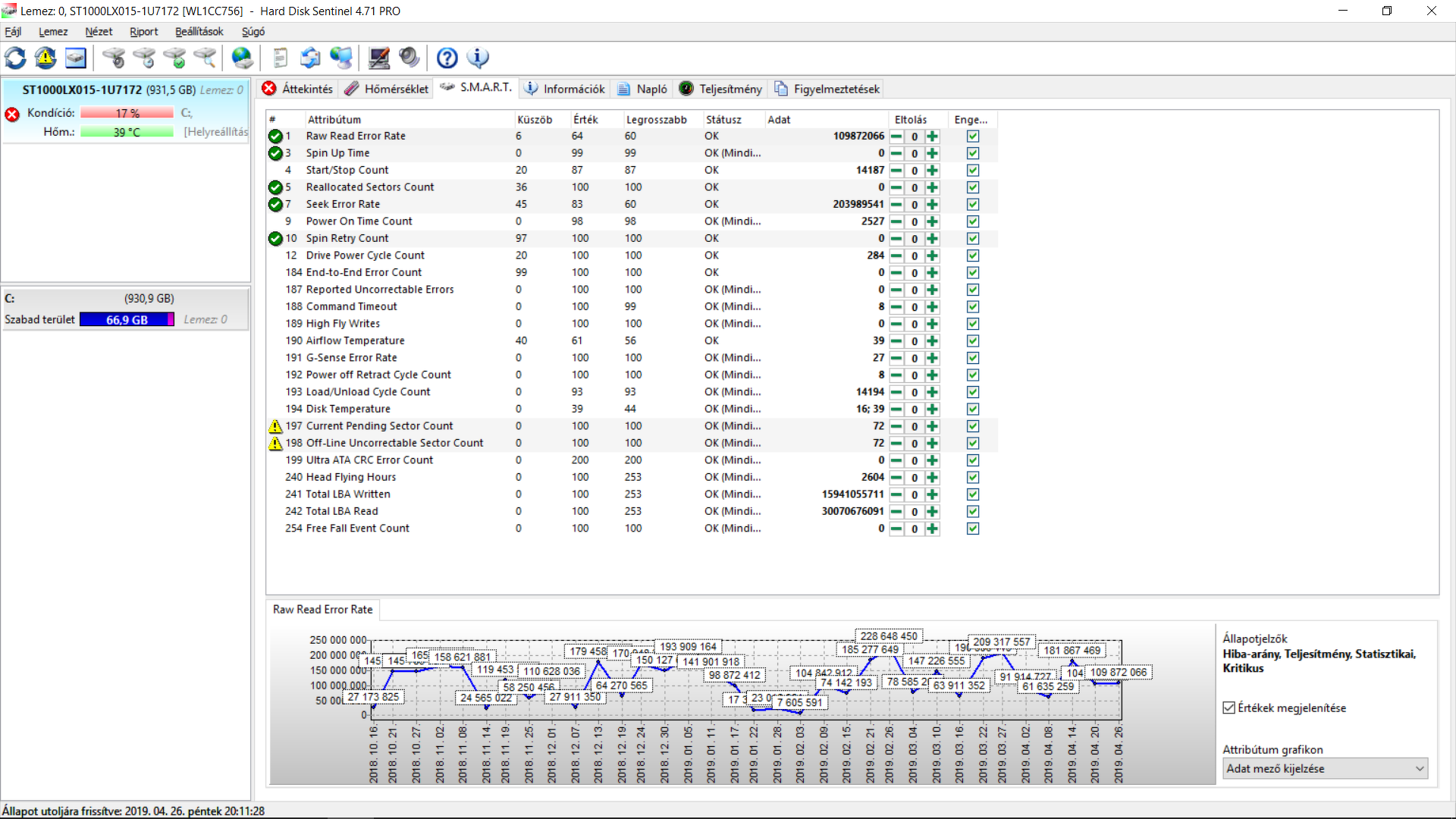 Üdv. mindenkinek. Számítógép Win10-ben kiírja, merevlemez hiba. HDD Sentinellel megnézve a csatolt képen lévőt adja. Esetleges tápegység hibát is ír a Sentinel, de akkor a másik HDD.nek is hibázni kellene, gondolom én. Amikor próbálom írni olvasni akkor jó.