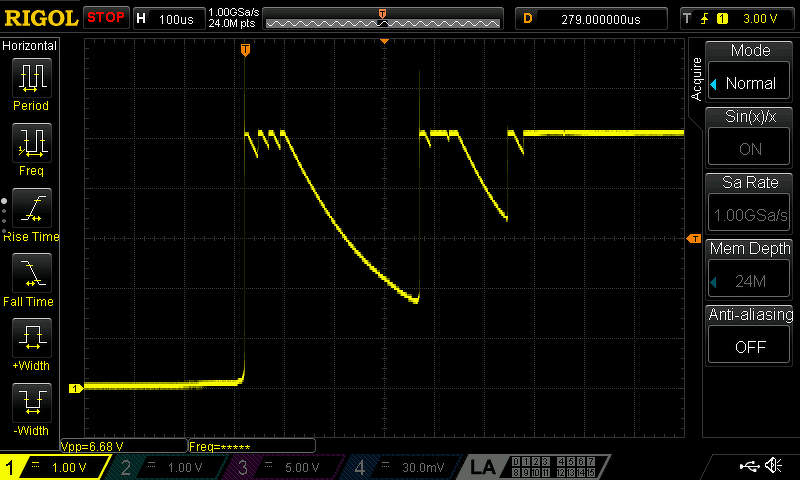 Nem akarlak elkeseríteni, de egy olyan tranziens vizsgálatra nem hogy a 138, de még a Hantek sem alkalmas, arra egy rendes szkópot kell venni, jó sok memóriával. A sok memória pedig azért kell, mert ha az a tranziens rövid (nx10-100ns) idejű (ahogy az általában lenni szokott), akkor egy ilyen hosszú jelfelvételi időben egy normál asztali DSO is elvérzik, mivel nem tud kellő mennyiségű mintát eltárolni ahhoz, hogy az a tranziens látható legyen a felvett jelben.