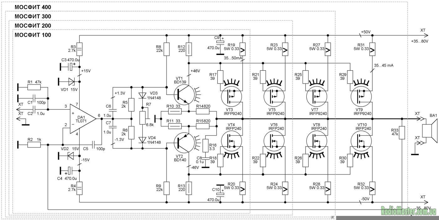 Szia! A ±50 V tápfeszültséghez szükségtelen a 3 pár MOSFET. Ez egy kipróbált kapcsolás.