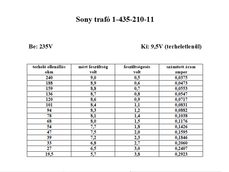 Aztán tegnap elkezdtem rajta gondolkodni, megmértem, terhelés nélkül 9,4V. De ebből még nem tudok meg semmit, pláne azt, hogy mennyi is a névleges feszültsége, és mennyi a terhelhetősége. Különböző ellenállásokkal elkezdtem terhelgetni, és az 1, kép szerinti eredmények jöttek elő. Nos, ebből én ugyan nem jutottam közelebb a megoldáshoz.