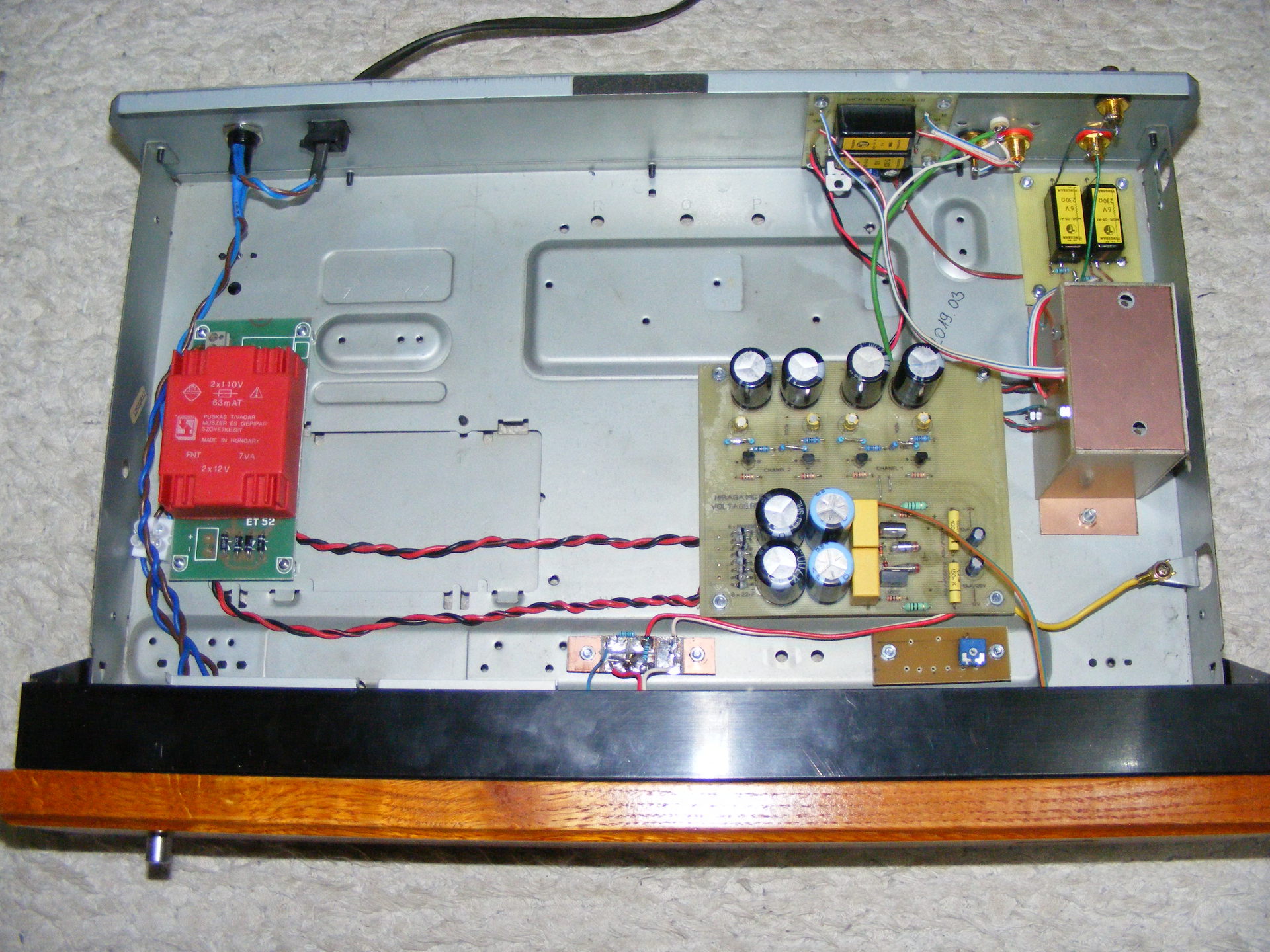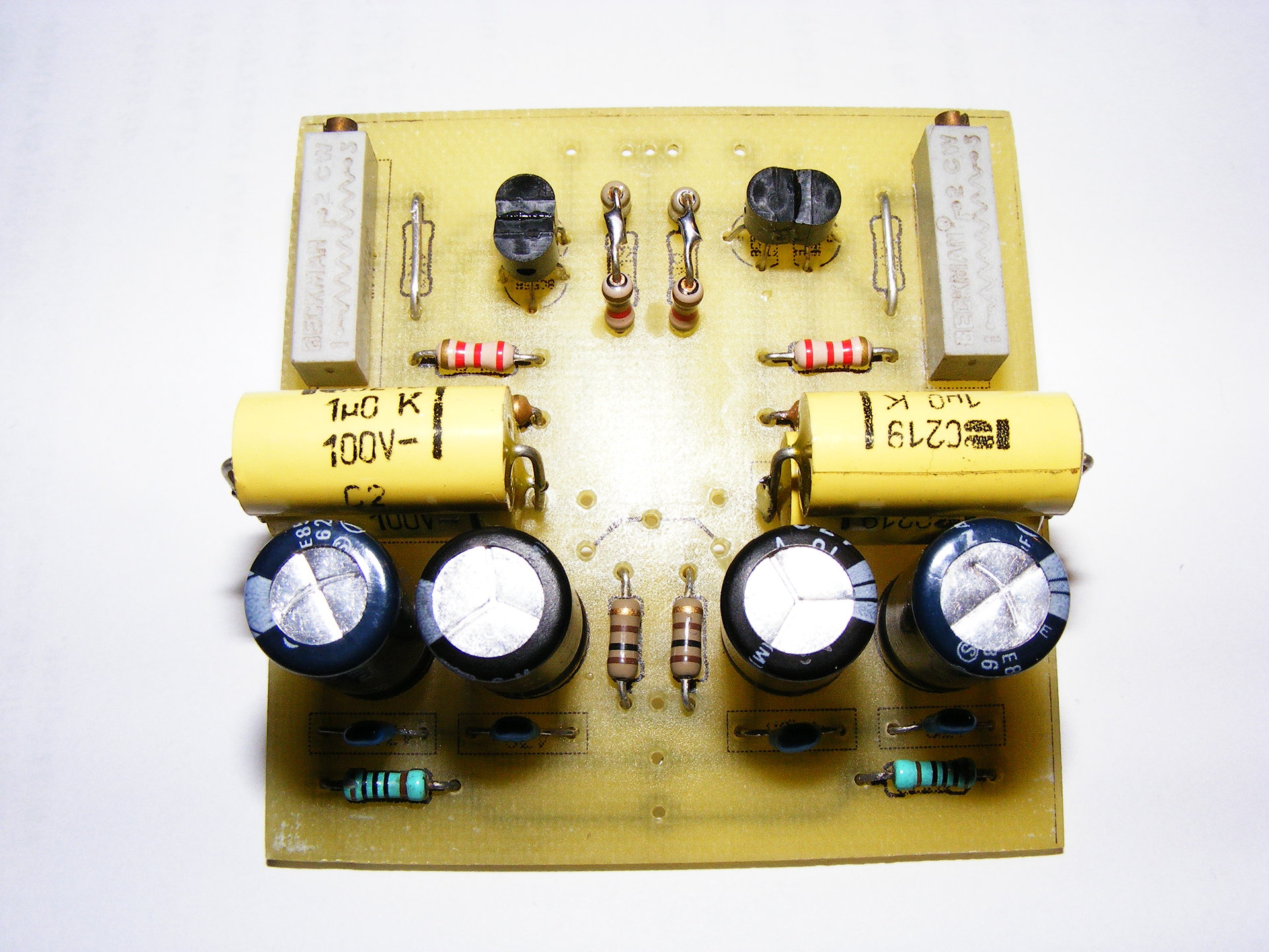 Ez pedig a "HIRAGA MC-pre" CHZ terve alapján. Már régebben összeraktam ezt az egyszerű kis áramkört de mivel nem volt MC hangszedőm ezért sokáig pihent a fiók mélyén. Most sikerült szert tennem negyed áron egyre, igaz nem új de egy jó állapotú DL-103-as. A tápja most készült el hozzá, azt magam terveztem 7905/7805 és utána TL431-es söntök. Meglepően jó a hangja. Igaz csak egy Mechlaboros DC-18/100-as trafóval tudtam összehasonlítani.