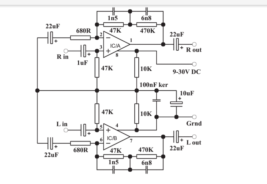 Szia! Az IC 4-es láb testen van, ez eleve eldönti a kérdést. Amit keresel, az két darab 10k ellenállás a 9-30V DC és a Grnd csatlakozási pontok között, Grnd-re hidegítve, erre a féltápra megy 47k ellenállásokon keresztül a két nem-invertáló bemenet.