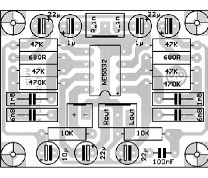 Az IC bemenetén lévő 47k-ellenállást cseréld ki 56k-ra, vagy 62k-ra, mert az NE5532-nek alacsony a bemeneti ellenállása és nem lesz meg a kívánt 47k bemeneti impedancia.