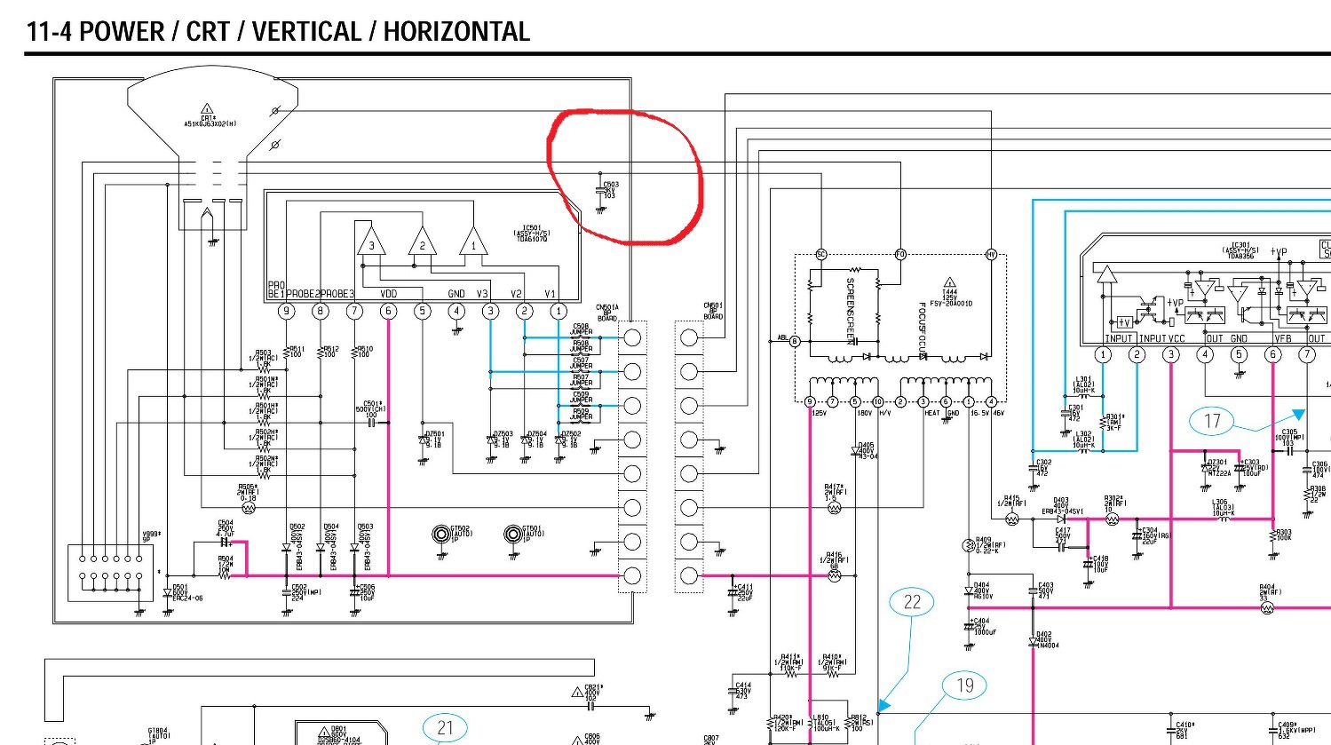 A gerjedést a tunerban levő egyik tekercskivezetés forrasztási hibája okozta. Ezek után úgy alakult a helyzet hogy 8-10 másodpercig szép kép és hang volt, aztán 1-2 másodpercig semmi. Jó-nemjó-jó-nemjó-jó-nemjó....(A NEMJÓJÁT EZ KONDIHIBA) És úgy is lett. A mellékelt képen bekarikázott 10nF/2KV-os kondit kicserélve (segédrácsfesz szűrés) a TV hónapok óta PANASZMENTES, dacára annak hogy egyes szakik a több mint 30 éves korára való tekintettel már lebeszéltek volna róla. Igaz, - TV javításból nem élnék meg, de ezt a hozzászólást azért írtam meg több hónap után mert ha valakinek (csórikának mint én) hasonló problémája van és ez alapján sikerül a TV-jét megjavítani ,már tettem valami jót.