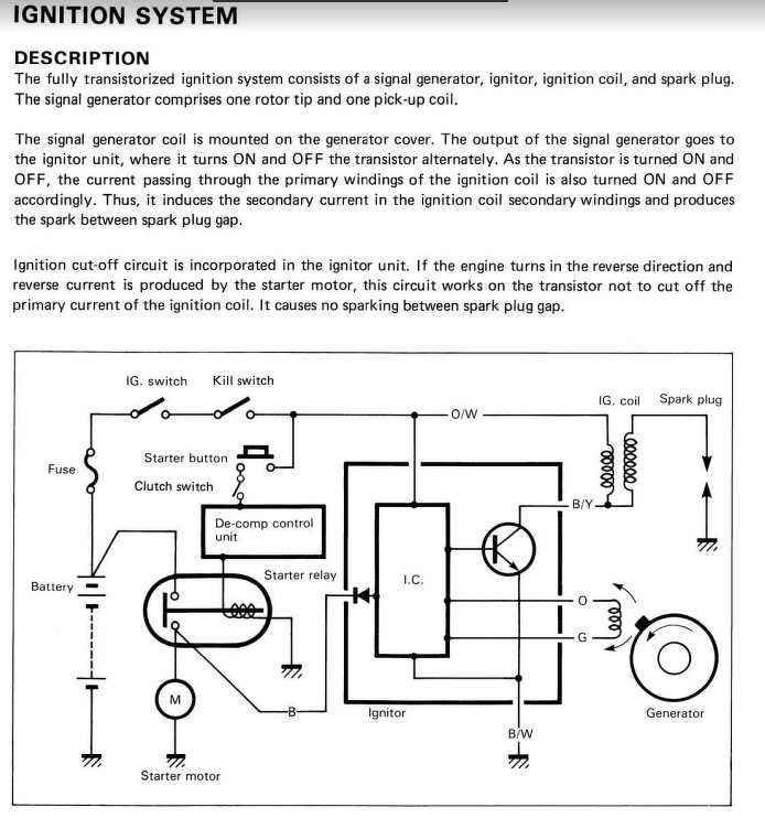 A lényeg: Van egyszer 2 vezeték, azon kaptam a "táprészt" a gyújtás, aztán egy jeladótól jövő ág, és ennyivel ennyi. Majdnem teljesen fekvő hengeres 4 ütemű motorról van szó, valószínűleg parazitaszikrás CDI gyújtás.
