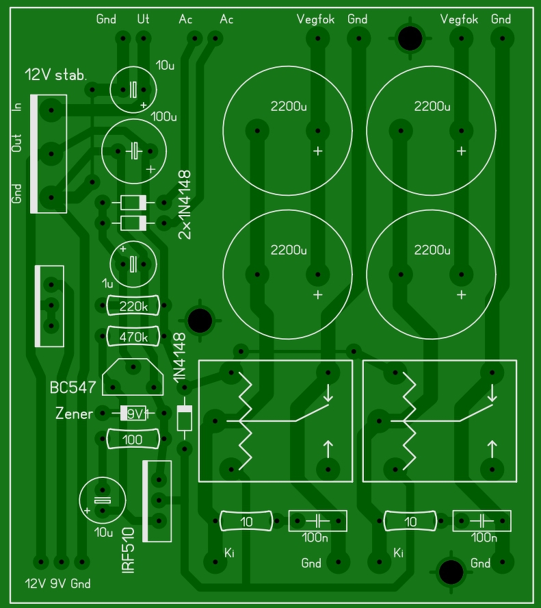 Egy trafó egy egyenirányító és egy puffermező. Majd innen vinni a tápot a két végpanelre.