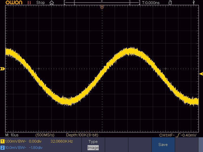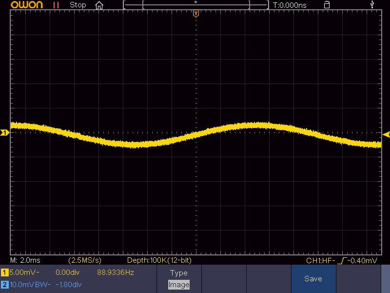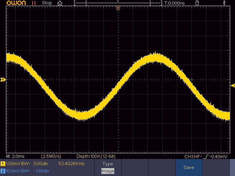 Itt vannak az Owon XDS zajok. A szinuszjel mindnél 4mV csúcstól-csúcsig. 50Hz, és 10KHz jelek. Szkóp bemenet 1mV/div, és 5mV/div, mert 1mV-nál bekapcsol a BW, 5mV-nál már nem, anélkül látható a zavarjel. Persze azt nem tudom a kimenő jelben mennyi a zavar, ez egy Siglent dds generátor.