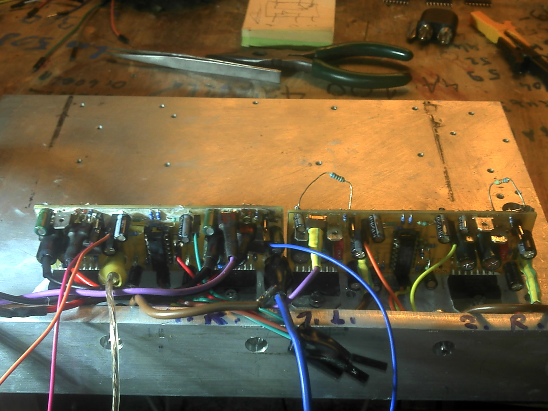 Eltettem az áthallásos paneleket. Raktam be helyette egy másik sztereo panelt. A képen is látszik. A bal oldali az új panel. A jobb pedig amire földre húzó ellenállást tettem. A különbség a két panel között, hogy az új nem gerjed a jumper kábel hatására. Erősebb a súgás a háttérben ennyi. A másik panel ennyi vezetéktől gerjedt. A földre húzást követően pedig halkan jódliznak a háttérben a sógorok az éteren keresztül ha nincs bemeneti jel.
