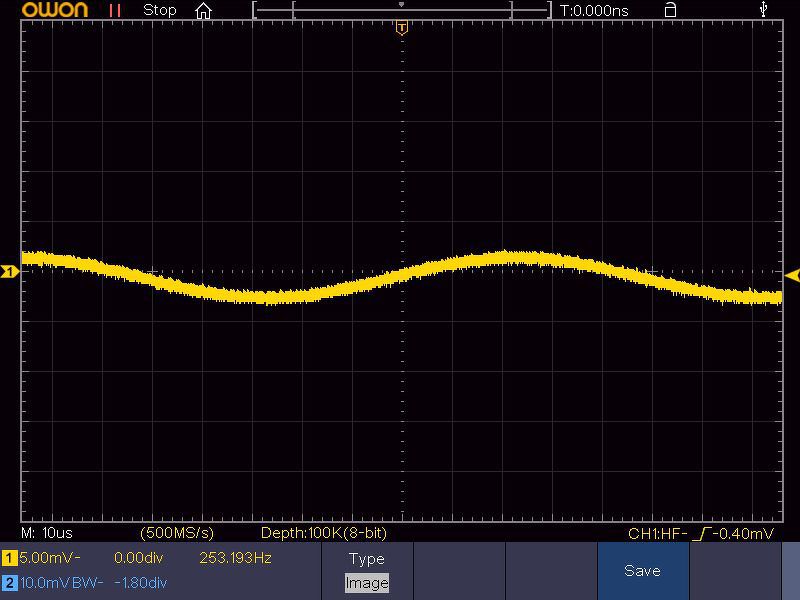 Itt vannak az Owon XDS zajok. A szinuszjel mindnél 4mV csúcstól-csúcsig. 50Hz, és 10KHz jelek. Szkóp bemenet 1mV/div, és 5mV/div, mert 1mV-nál bekapcsol a BW, 5mV-nál már nem, anélkül látható a zavarjel. Persze azt nem tudom a kimenő jelben mennyi a zavar, ez egy Siglent dds generátor.
