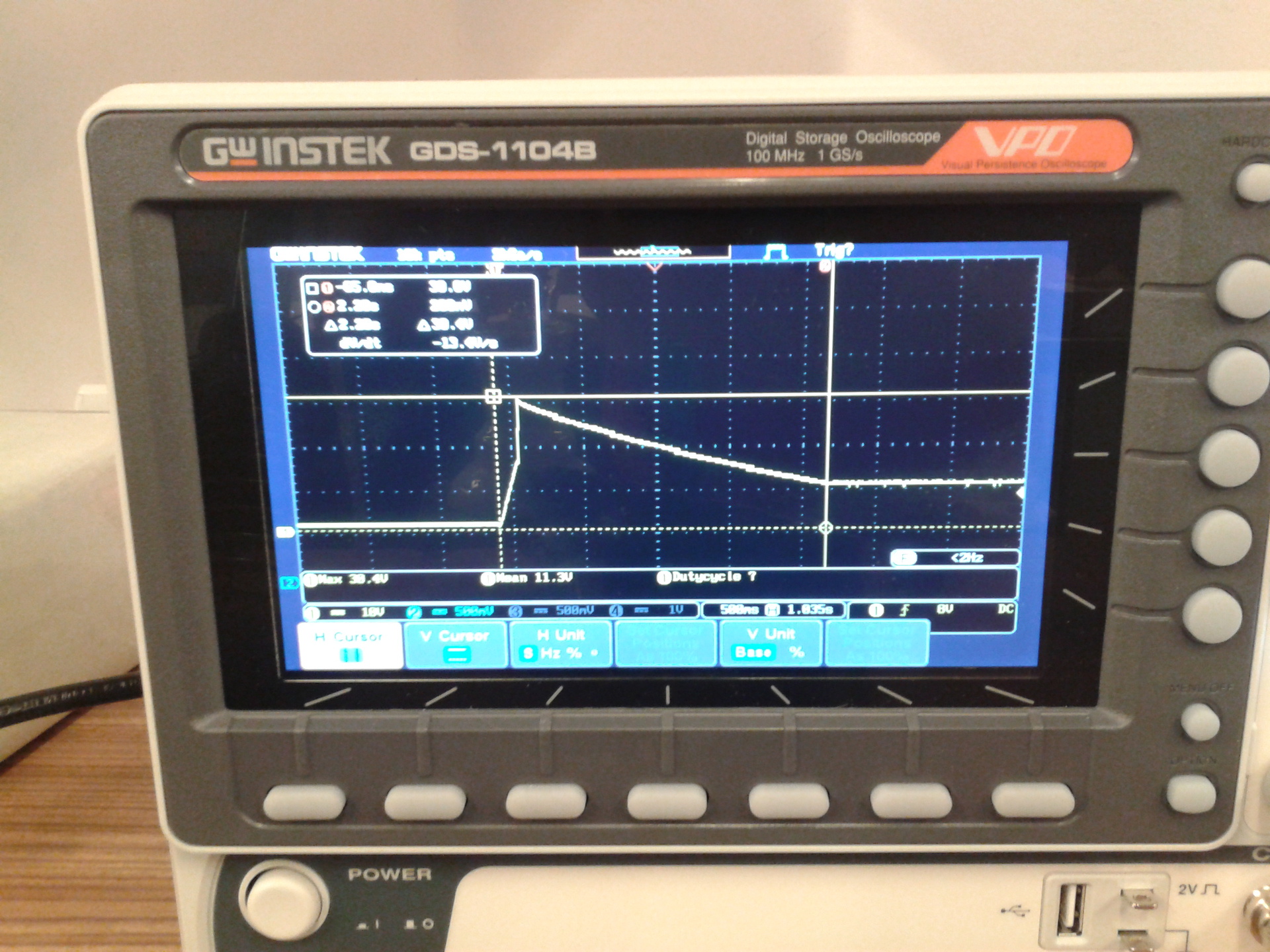 Nem tudtam időt szánni rá, hogy egyáltalán megírjam az eredményeket, és majd még valószínűleg vissza is kéne mennem a szkóppal ellátott műhelybe, hogy folytatni tudjam. De múlt héten mértem a Vcc lábon szkóppal, lásd mellékelt fotót. Nagyjából látom az adatlap szerinti működést, vagyis elkezdi tölteni a 22u-s kondit, kb. 15 V-nál történik valami, gondolom elindul a kapcsolóüzemű rész. Csakhogy ott kicsit túllő az előírt max. 26 V-on (9. oldal), felmegy egészen 30-ig. És nekem úgy tűnik, mintha ott kapcsolná le a működést, elkezd beesni a tápfeszültség, és kb. 9V-nál életbe is lép az erre kitalált védelem, onnantól nem fogyaszt tovább. Labortáppal a 22u-s kondira kapcsolódva, látszólag jól működik, vagyis: 16 V tápfesz alatt semmi, utána 1.4-2 mA áramfelvétel. Ha a feszültséget lefelé tekerem, kb. 9.5 V-nál ez 0-ra csökken. De ennél a mérésnél hálózati táplálást nem adtam a készüléknek, tehát nem tudta feljebb tölteni a kondit a labortáp kimeneténél.