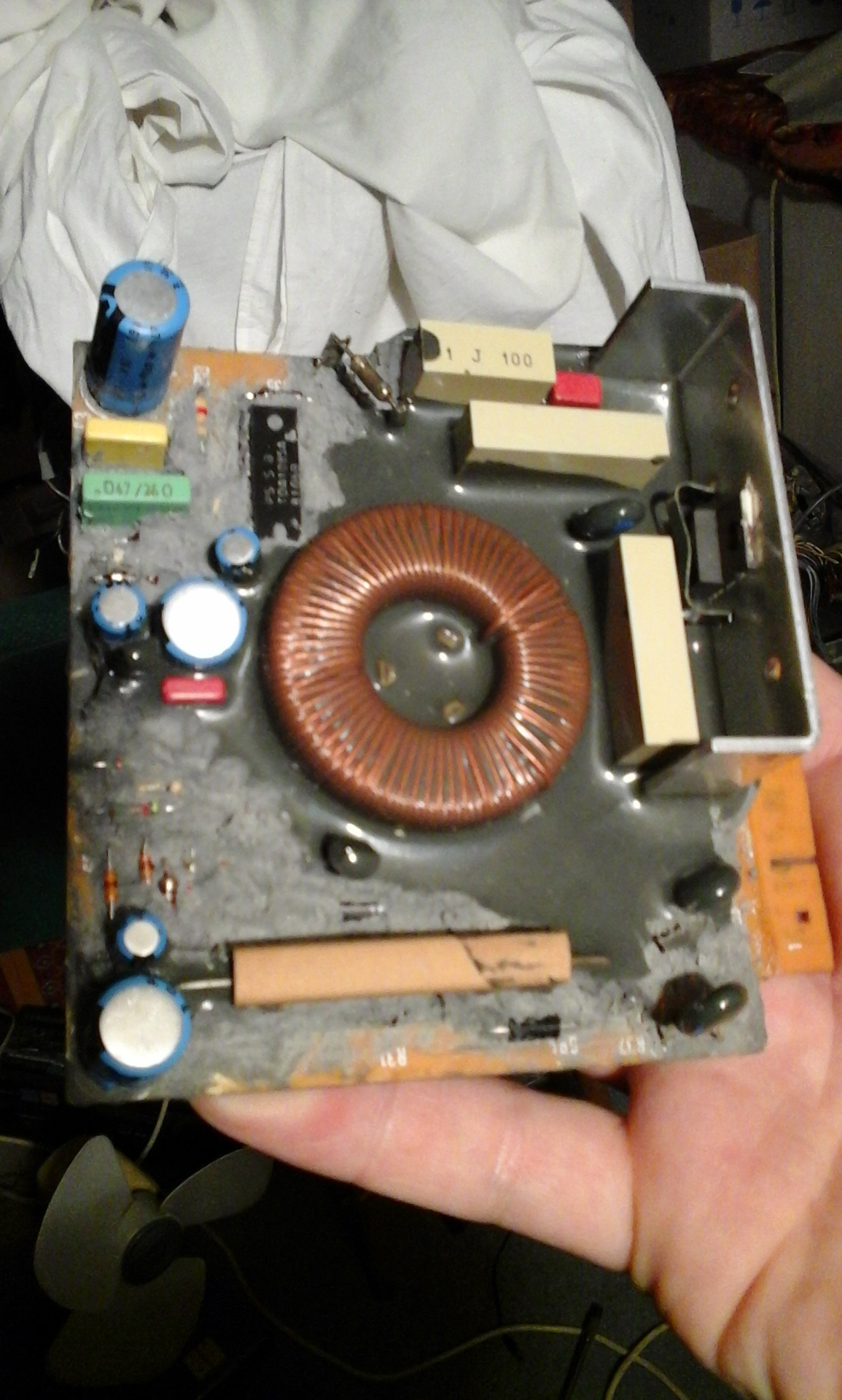 A panelen van egy toroid tekercs is. A panel a gyári minta alapján lett újratervezve és megépítve, viszont sajnos nem működik. Teljesen süket. Sajnos nem zárható ki, hogy amikor a szétszerelés történt, akkor egy alkatrész beforrasztási helye el lett írva, erre már nem emlékszem. A toroid tekercs miatt ki volt öntve az egész gyantával és egyesével kellett haladni előre, kikaparászni és kiforrasztani az alkatrészeket. A kiforrasztott alkatrészek mind megvannak, hozzá felírva, hogy honnan lett kiforrasztva. (itt fordulhatott elő esetleg egy felírási hiba)