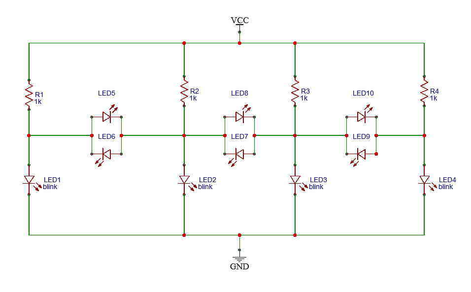 A másik , hogy mennyire fognak a „hídátlóban” lévő antiparalel ledeken keresztül a villogó ledek tápáramai változni részben így „szinkronizálódni” , egymásra hatni , a „kört” be lehetne zárni a LED4-1 hídátló közé rakott ledekkel is.
