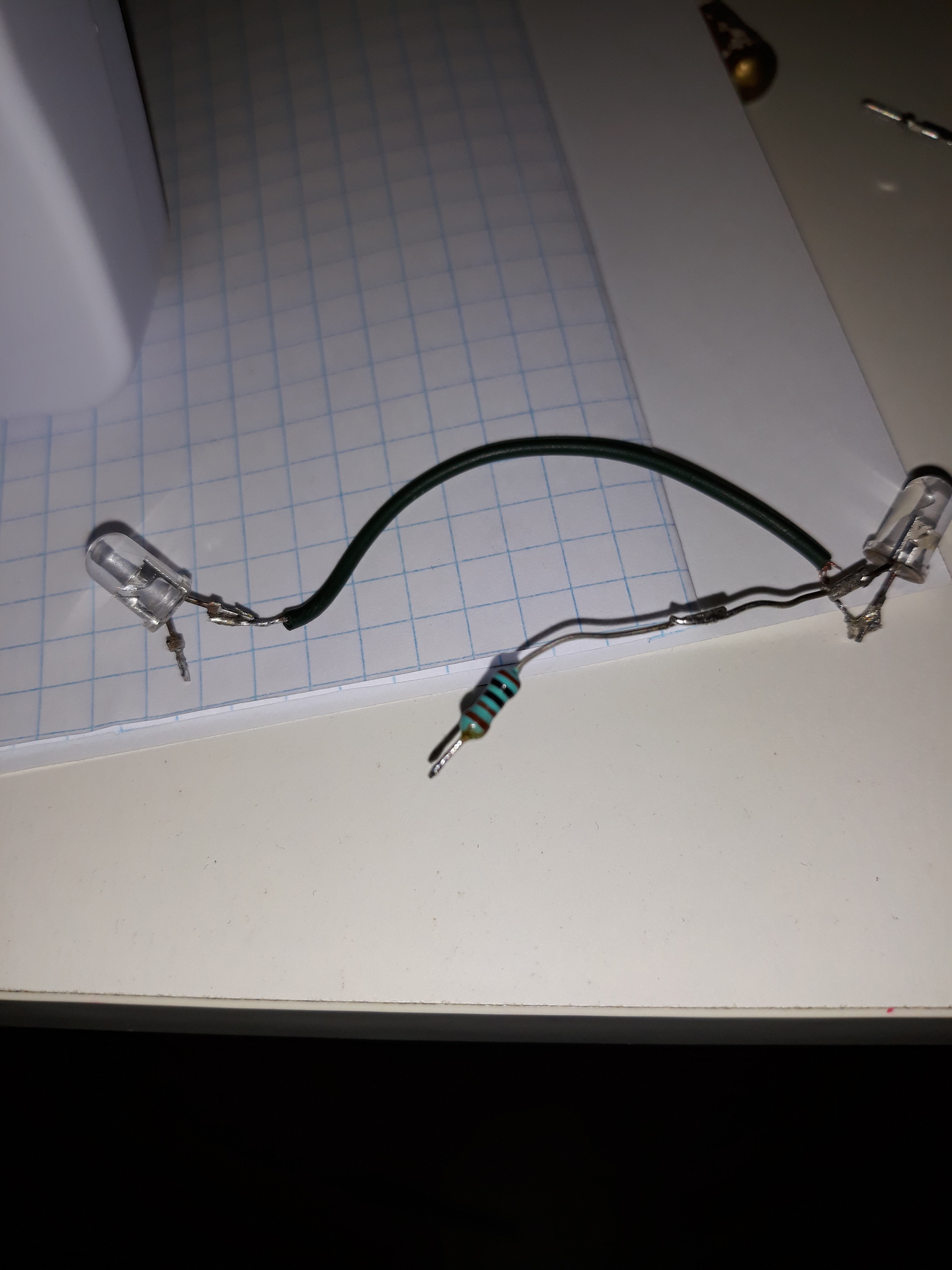 Azaz a gyertya LED katodja megy majd a 12 V minusz polusára. A másik LED rövidebb lábát kösd a ez elsö LED anodjához (hosszabb, + láb). Egy ellenállásért el kell menned a boltba ha ilyesmi nem hentereg otthon.Ott kérjél néhányat 4,7 és 10kOhm tartományban (4,7k, 5,6k, 6,8k, 8,2k meg 10 k). Esetleg vehetsz egy pár 1-2 k ellenállást is vagy egy egy 10 kOhmos trimmert a finom hangolásra. Ezek mind filléres alkatrészek. Ezt az ellenállást kösd a második LED anodja meg a +12V közé és meglátod mi lesz. Jobb a nagyobb ellenállással kezdeni.