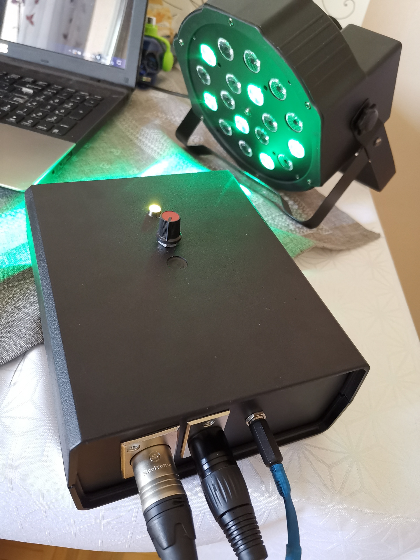 Sziasztok! Nem egy hatalmas dolog, de az adott feladatra tökéletes lesz: egy 12 csatornás arduinos DMX adó-vevőt. Egy 12 csatornás dimmert fog vezérelni. 2 kiemelt csatorna van, ezeken reflektorok vannak, oldalfényként. A többin PAR lámpák. Amit tud: