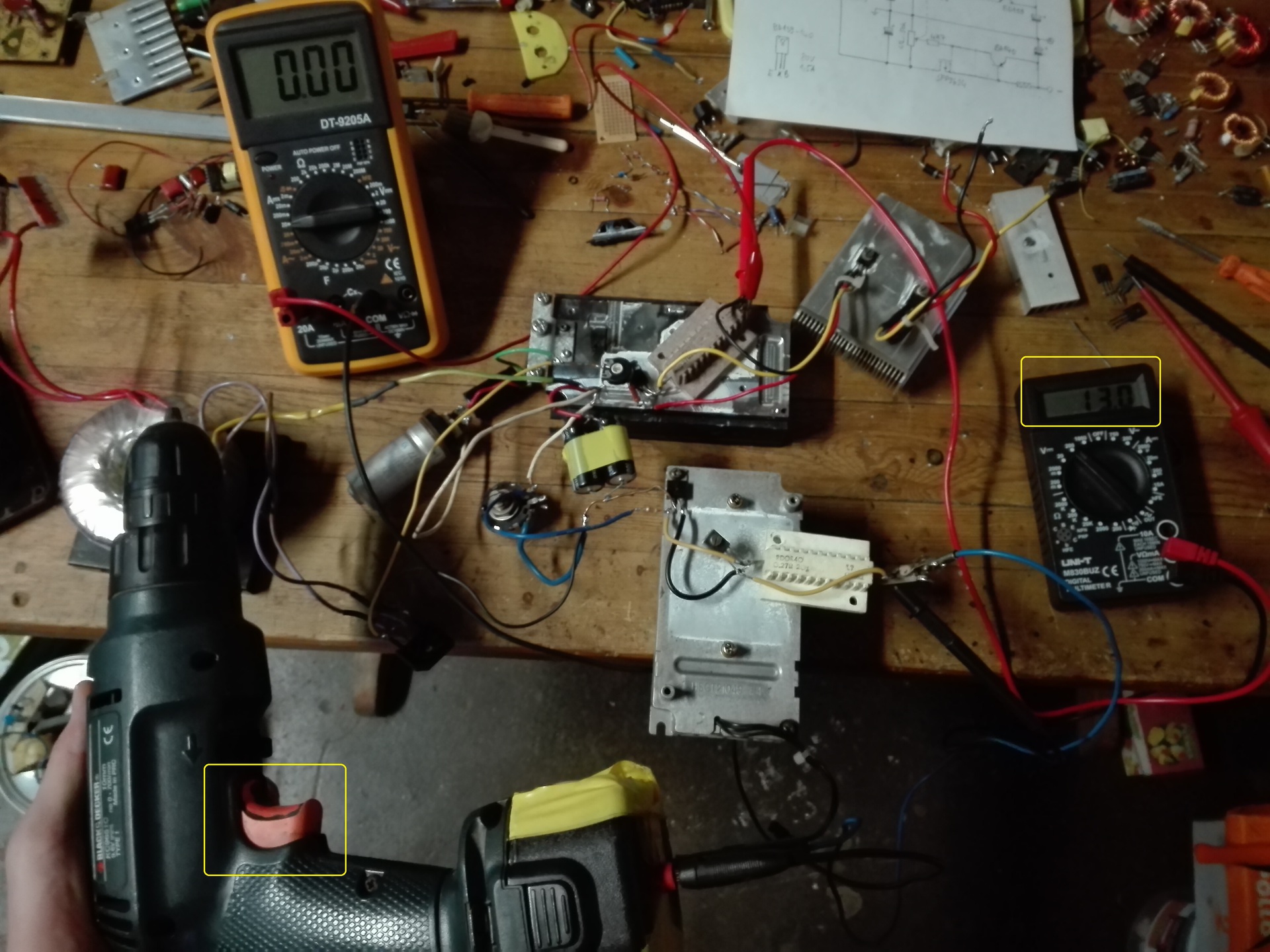 Végül kipróbáltam az akkus fúróval is. Nos hát beállítottam 13 voltra de miután elindítottam a fúrót leesett 6 voltra és 1,2 Ampert vett fel felpörgött állapotban. Szóval kb ugyan az mint volt ugyan úgy esik a feszültség bár már nem annyira. Valamit elrontottam vagy ezen még valamit módosítani kéne? A graetz után plusz ágban 2 1000µF 63 voltos kondi van bekötve és ugyan így a negatív ágban is, tudtommal tápok pufferelésénél amperenként kell 1-2 ezer mikró tápfeszre méretezve, mivel a trafó 1,8 A-os áganként (elvileg áganként annyi ahogy fel van tüntetve rajta, tehát összesen 3,6 amperos) így egy ágra elég 2000µF de a másik az, hogy a fúró nem is terhelte 2 amperre mégis elég sokat esett a feszültség.