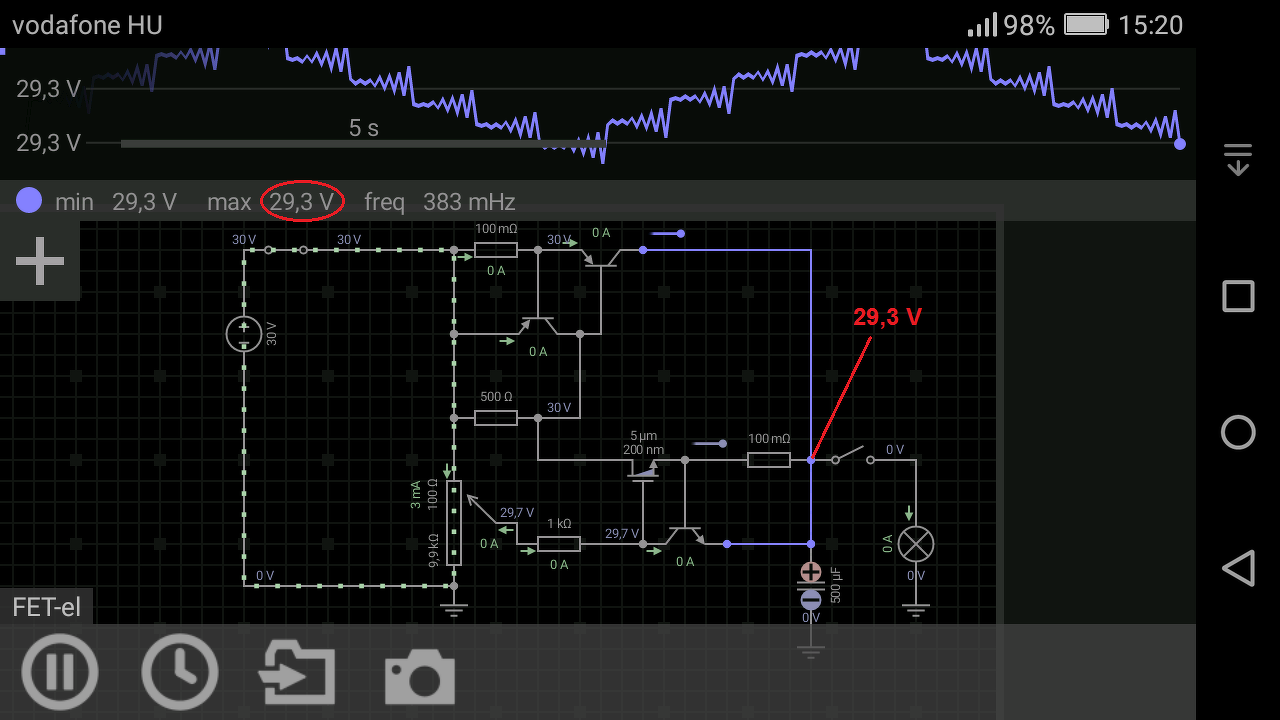 De van egy ötletem kibővítem egy áramgenerátorral. Látni, hogy a nagy áram az áramgenerátoron folyik, a FET-en csak kis áram folyik de a feszültség szabályozást elvégzi. A terhelés rákapcsolása után ugyan esik a feszültség (29,3 voltról 25,2 voltra) de ez már nem olyan nagy esés. Talán így működhet.