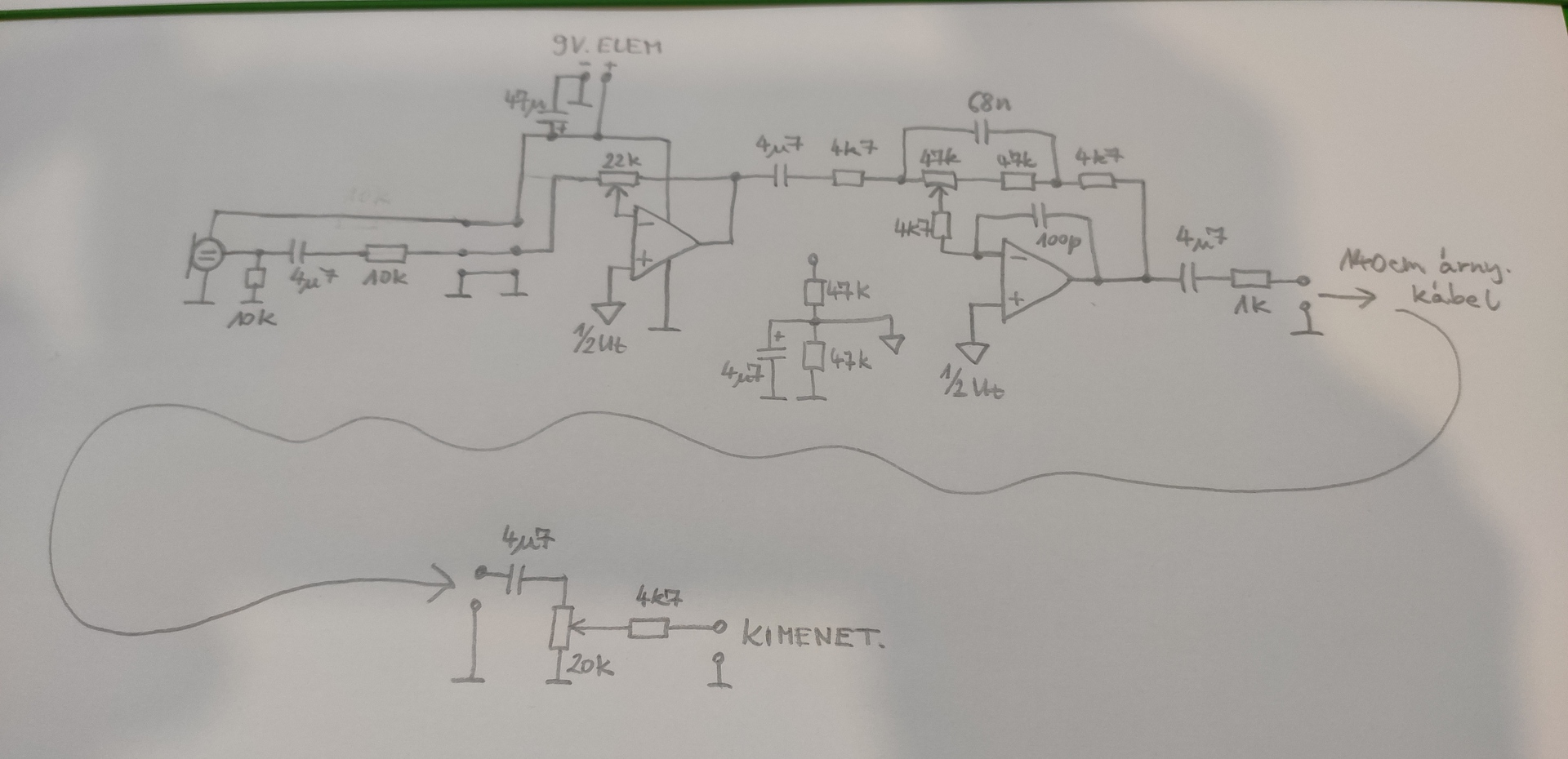 Szeretnék segítséget kérni, mikrofon előerősítővel kapcsolatban. Csatolom a rajzot, ezen látható a kétfokozatú előfok, amit építettem. Működik, szépen és tisztán szól. A gond az, hogy néha elkezd recsegni. Hol jobban, hol kevésbé. Van, hogy egy ideig semmi gond. A bemeneti erősítés szabályozó és a hangszínszabályozó trimmereket már kivettem, helyettük ellenállásokat tettem be, a trimmer középértékére állítva. Az előerősítő után, van egy 140 cm hosszú árnyékolt kábel, amit már kicseréltem csatlakozóstól. Egyébként ez egy harmonika basszus oldali mikrofon része, ami a légszekrényen keresztül, átmegy a jobb oldalra, ahol a hangerő poti van, majd onnan megy ki a Jack aljzaton keresztül a keverőbe. Amíg a poti elé közvetlen nem tettem be egy soros kondit, addig a poti tekerésre sercegés hallatszott és nagyon hangos volt a recsegés. A kondi beépítése után, a recsegés sokkal halkabb és a poti tekerésekor, nincs semmi zaj. Arra gondolok, hogy a második, a hangszín fokozat kimeneti impedanciája, nem illeszkedik a képbe. Mindenképp kell elé egy előerősítő rész, mert a mikrofon Linkwitz módban van bekötve, elég kicsi a jelszintje. Gondoltam, kipróbálom egy neminvertáló első fokozattal, onnan menne a (invertáló) hangszínre, majd onnan egy kimeneti illesztő (invertáló) fokozatra. A belső hangszínre, pontosabban mély kiemelésre szükség van, mert ha közösítve van a két oldal, nem lehet külön hangszínezni a keverőn, tehát még előtte kell. A tápfesz szimpla 9v-os elem. Ha valaki tudna valami okosat mondani, megköszönném. Köszönettel: Tibi