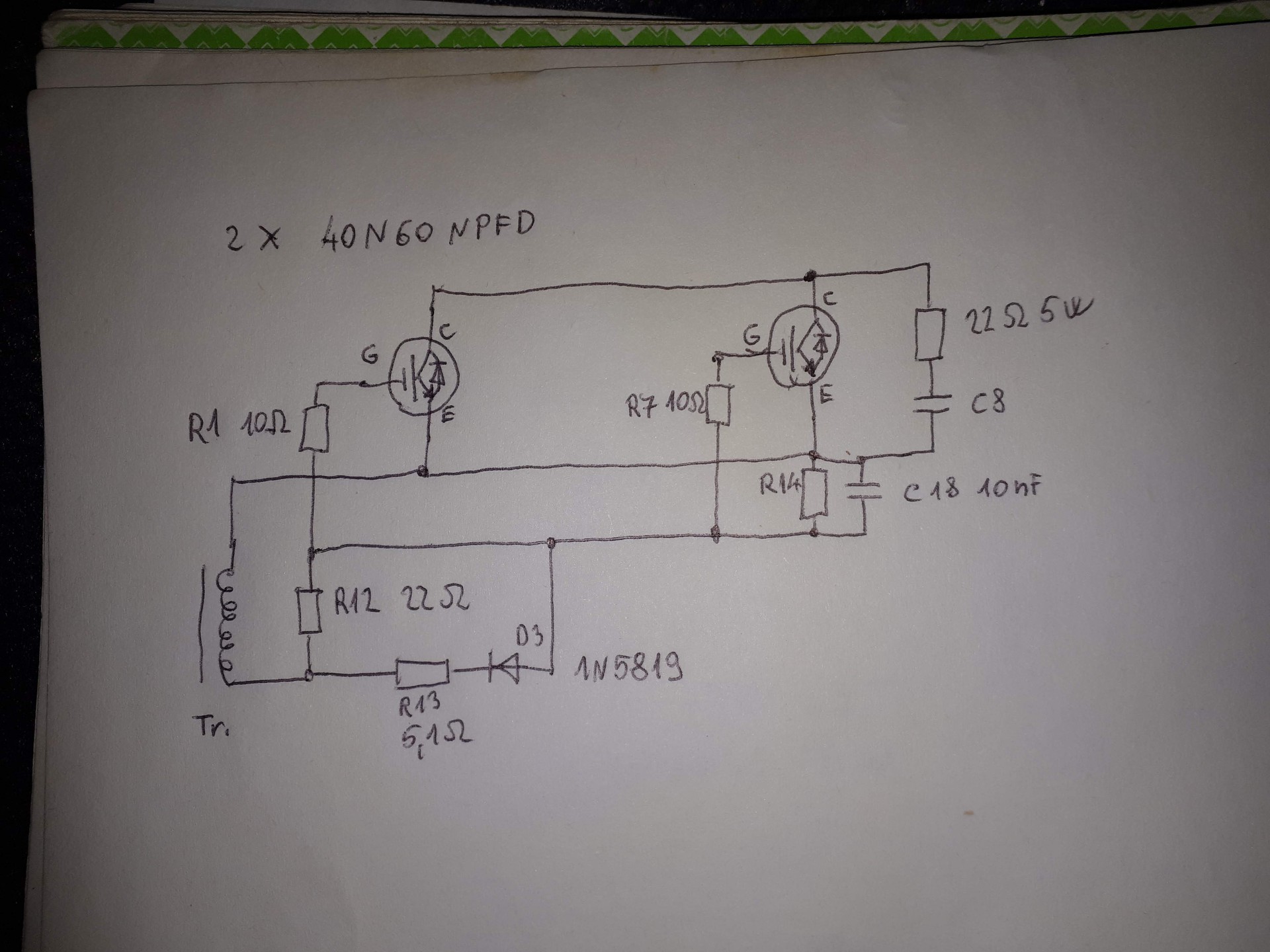 R=2*Pi*f*C képlettel kiszámítható a felső vágási frekvencia, de mivel R12 -vel shöntöli a trafót, így bonyolódik a képlet a belépő induktivitással. Nyiilván azért az égett le, mert értéke kevesebb lehetett a 22 Ohmnál. Én megpróbálkoznék első körben a 22 Ohmmal, IGBT nélkül mérve szkóppal a G-t 20 V fölé nem illene mennie, akkor lehet tovább csökkenteni, mert R14-R12 egy párhuzamos osztót képez. Javaslok a G-E közé egy 18V os Zener + beépítését. Az enyém is elszált első körben, / így nézett ki a robbanás után / majd egy új szett beépítése után működik évek óta hibátlan. Gyanítom, hogy a " gagyit is el kell adni alapon" a kici-kínai először a még éppen működőt pakolja bele.