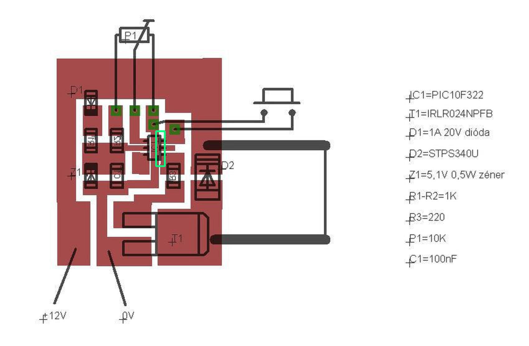 A tápot a huzal hossza és ellenállása határozza meg. Nekem jelenleg egy 12V 5A-es tápról megy. Az áramfelvétele 1,3A a jelenlegi beállításokkal. Maga a vezérlő 6-24V-ig tud működni. Nem induktív terhelés esetén a STPS340V jelű dióda akár el is hagyható, de célszerű akkor is egy kisebb 0,5A 50V körüli schottky diódát berakni helyette. Ennek az a szerepe, hogy kioltja a kikapcsoláskori feszültségtüskéket, ezzel gyorsítva a FET kapcsolását, ami által a FET szinte egyáltalán nem melegszik. Ha megnézed az eszközről feltöltött képeket, láthatod, hogy a szár, ami a huzalt tartja íves. Ha a huzal nincs benne, akkor pedig egyenes lesz. Azaz a szár rugalmas, így a szál feszítését folyamatosan biztosítja. Mellékelem a kapcsolási rajzot. A hozzászólás módosítva: Júl 15, 2019