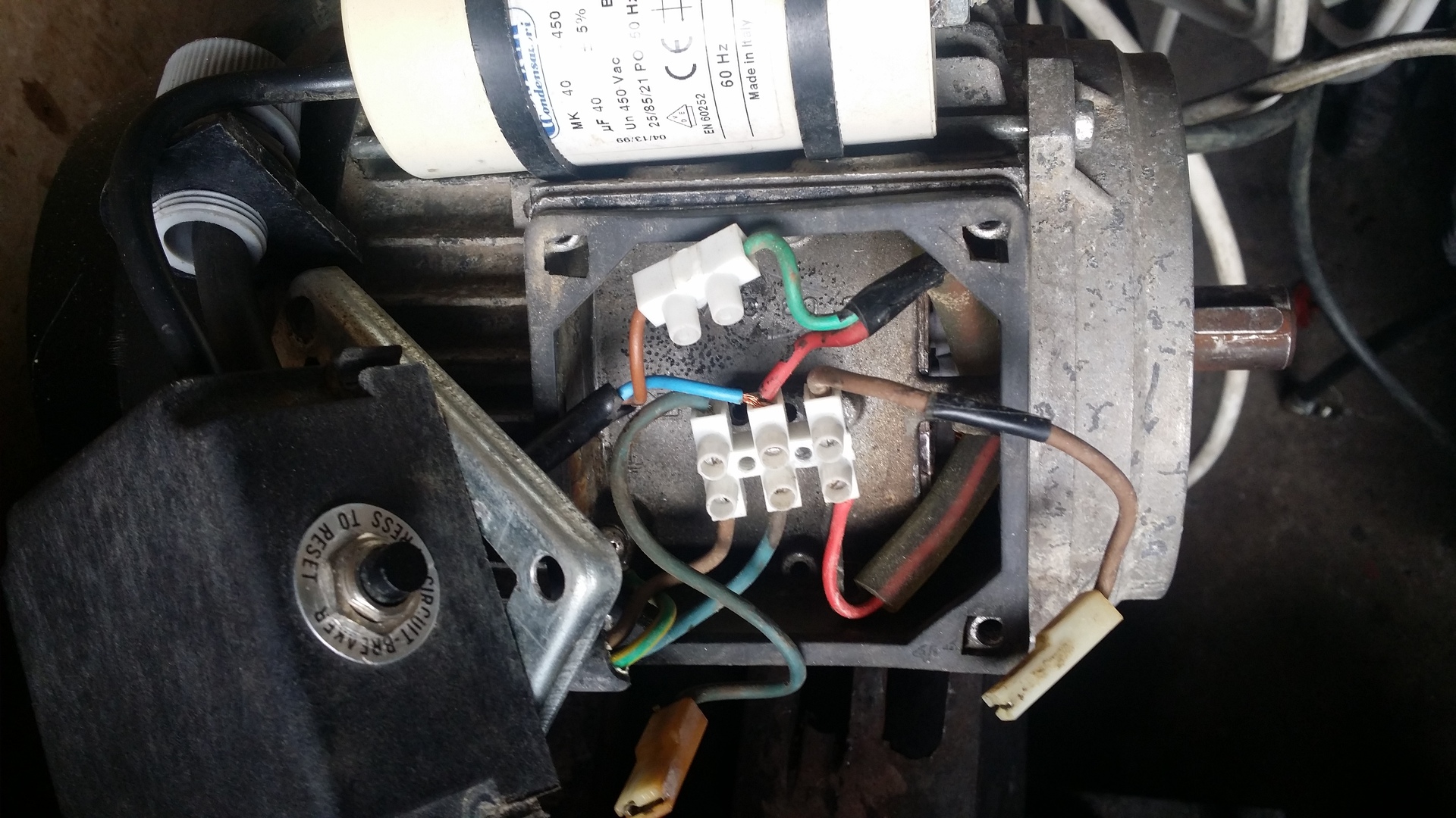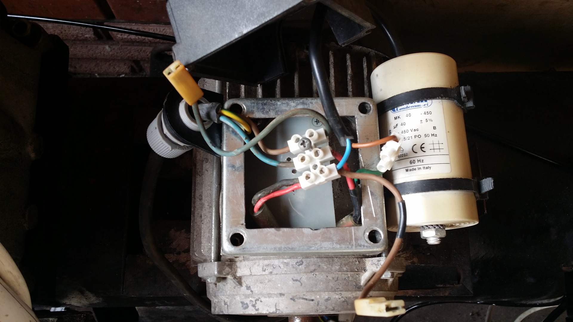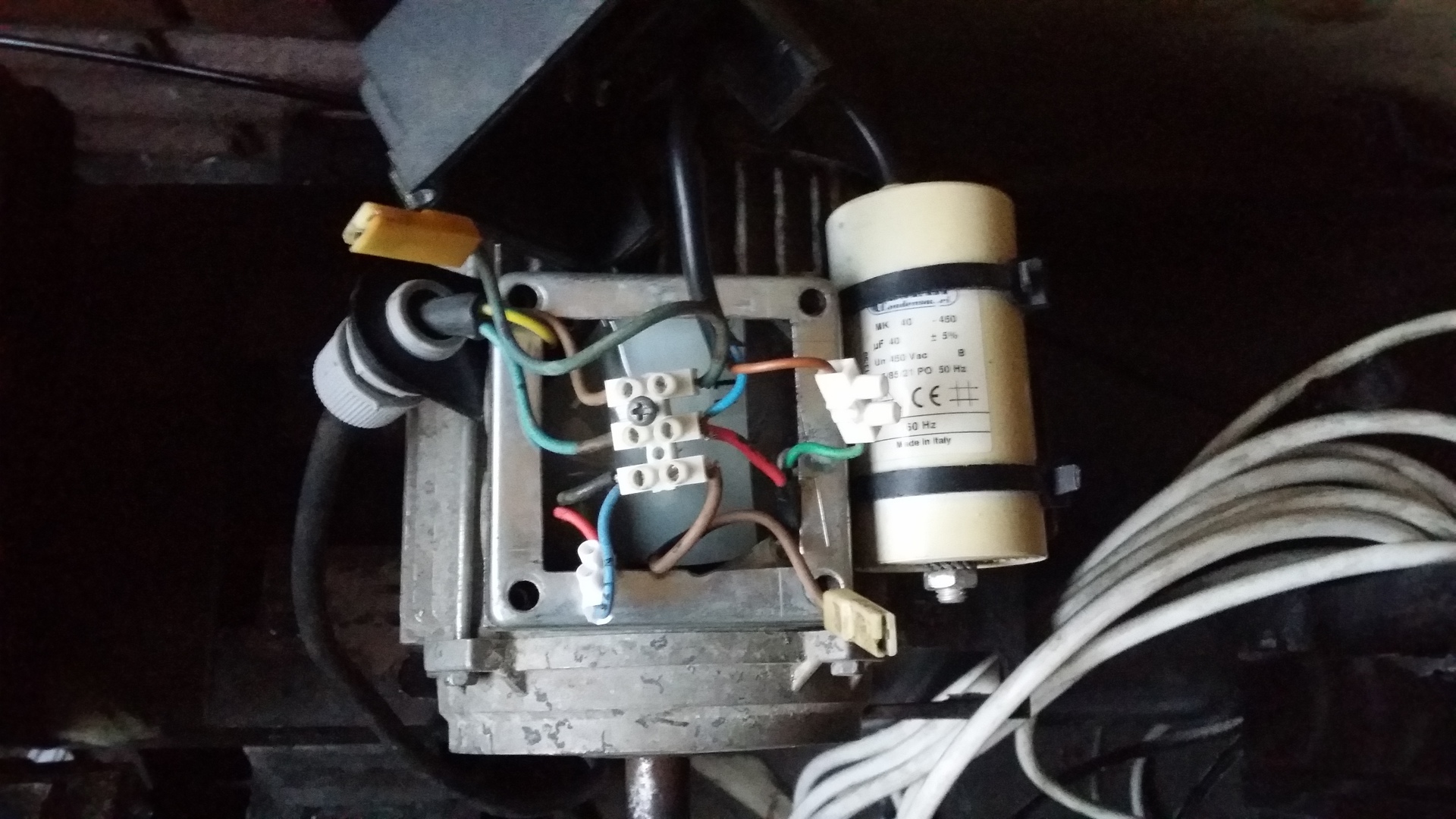 Azért eléggé jól látszik, hogy a motorba menő két piros a főfázis, a zöld a segédfázis, a vékony kék-barna a kondenzátor, a vastagabb kék barna meg a betáp.