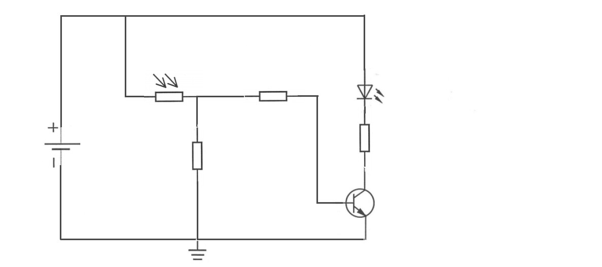 Ez a kapcsolás fordítva működik mint egy alkonykapcsoló. A fotoellenállás értéke fény hatására csökken, a feszültségosztó kimenetén a feszültség emelkedik, a tranzisztor kinyit, a LED világít. De találsz itt segítséget: