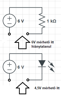Ennél szerintem bonyolultabb a téma, és emiatt nem sikerült teljes mélységében megértenem egyelőre. Ha egy 6VDC feszültségforrás pozitív pólusára csatlakoztatok egy (például 1kOhm-os) ellenállást anélkül, hogy az ellenállás másik végén keresztül zárnám a kört, akkor a feszültség a feszültségforrás negatív pólusa és az ellenállás másik vége között 6V lesz hiánytalanul. Ezzel szemben, ha az ellenállást kicserélem egy ledre, akkor kimérhető az az 1-2V feszültségesés, amiről ledek esetén beszélni szoktunk.