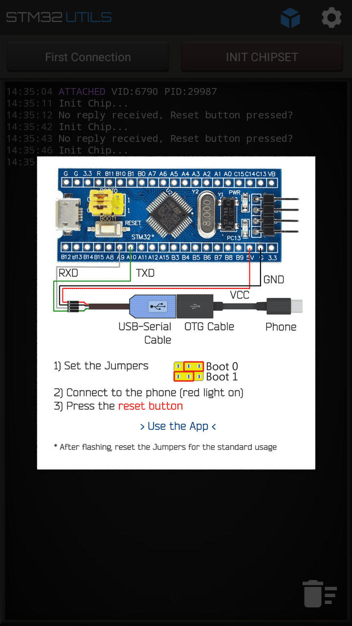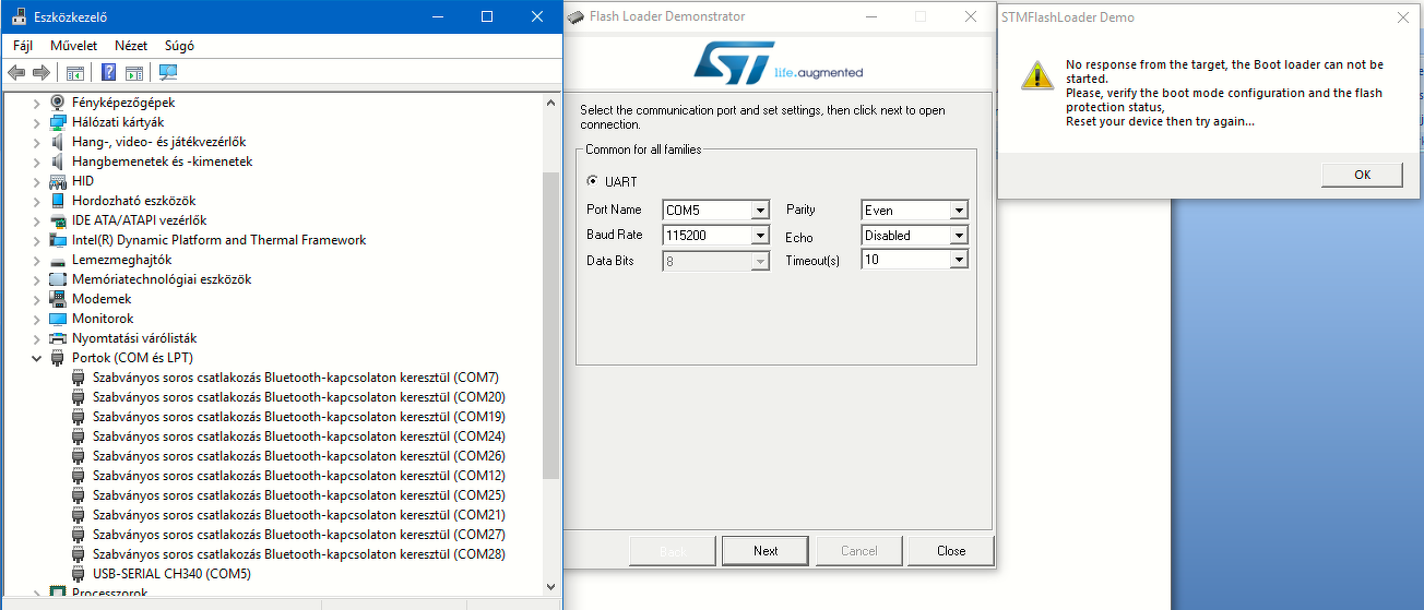 Segítséget kérek az alábbi project megvalósításához, HW and SW eszközök rendelkezésre állnak. http://hscope.martinloren.com/HS101-oscilloscope.html Elsőre egyszerűnek tűnik mint a faék, de sajnos egy ideje már megy a szivacs. Az STM32F103C8 Blue Pill tápfeszre kötve piros Led/Táp/ folyamatosan világít és a PC13-on levő zöld Led villog, ebből ha jól következtetek, a chip-be bootloader és blink betöltve gyárilag. A mellékelt képen látható üzenet szerint nem ismeri fel az eszközt, nem csatlakozik, Vajon miért, mit nem csinálok megfelelően, természetesen Reset-et nyomtam Tx/Rx összekötések megfelelőek. /próbáltam fordítva is, de hiába/ Próbáltam win10 alatt flasch-elni más progikkal, a mellékelt képeken látható az eredménytelenség. Számtalan internetes leírást tanulmányoztam, de nem jutottam eredményre, vagy talán mindig ugyanabba a hibába esek.