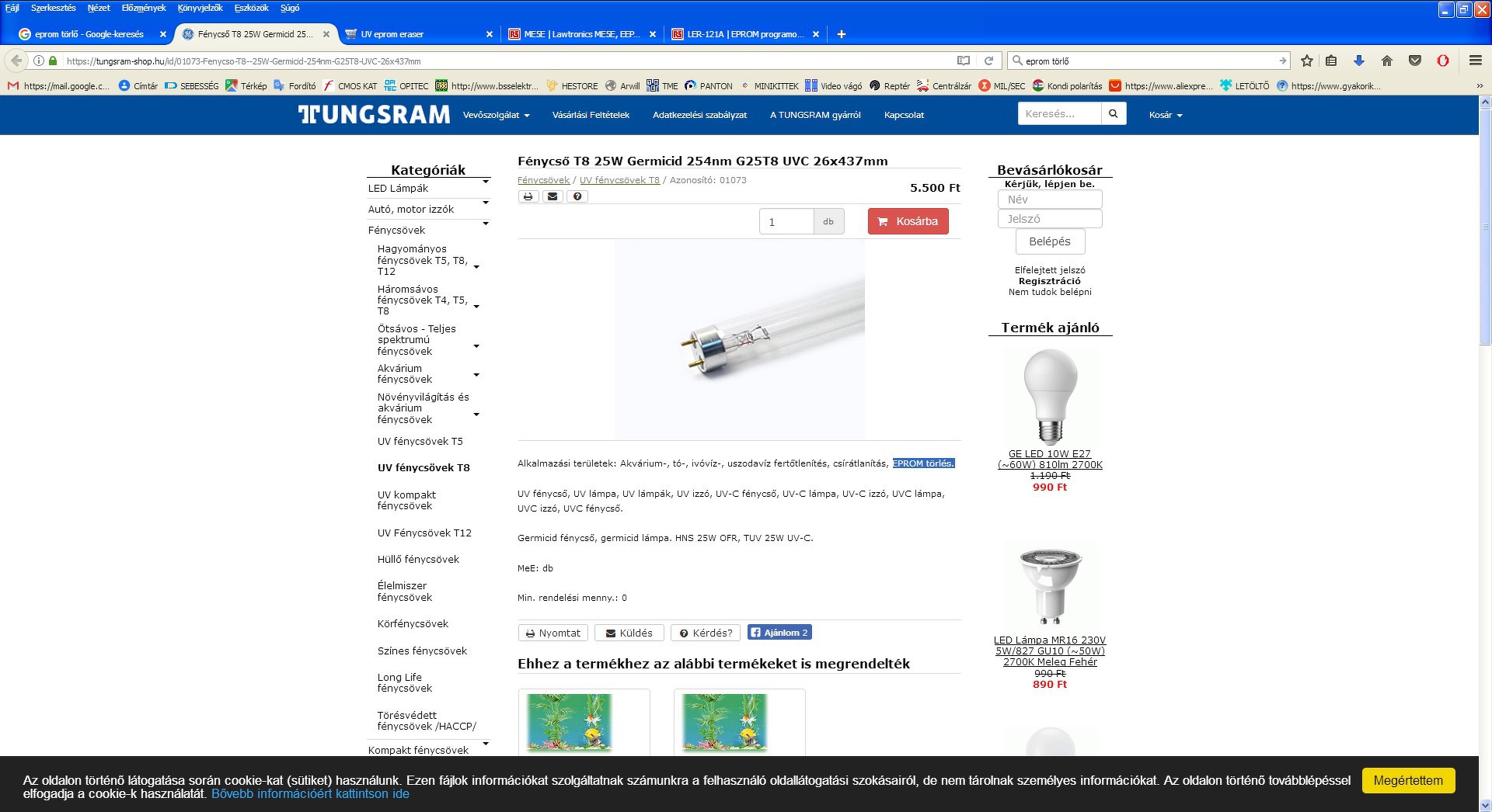 Ilyenek a rovarcsapda, pénzvizsgáló, akvárium világítás stb. EPROM törléshez olyan cső való, amibe nem szabad belenézni. Ez pedig a Germicid cső, vagy az összetört burájú HGL. Ha nem jól tudom igazítsatok ki. A hozzászólás módosítva: Aug 2, 2019