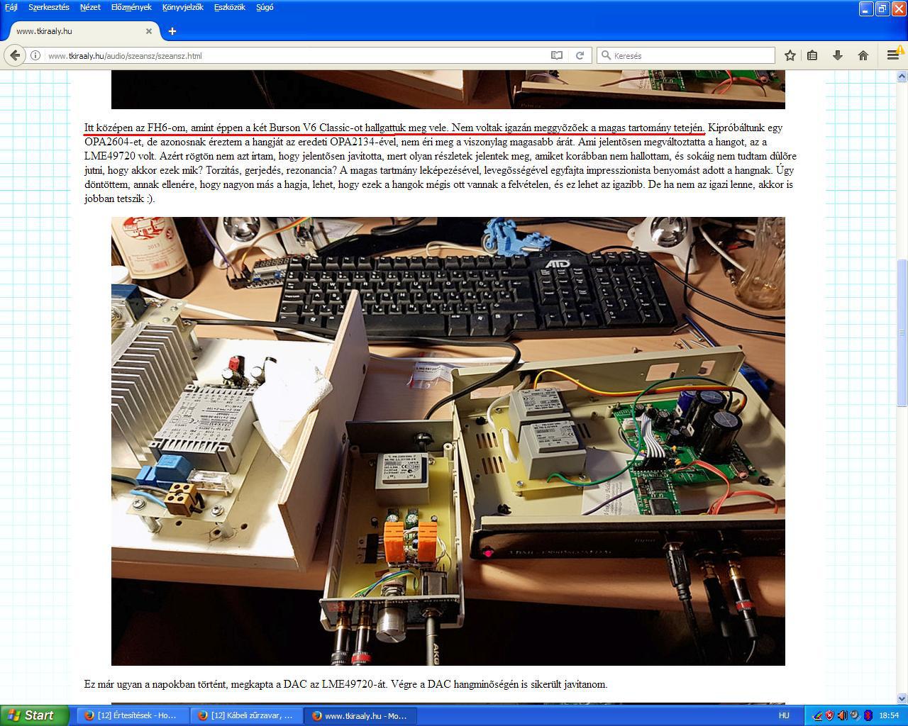 anno a FH6-300 a HD650-em miatt készült, mivel a FH6 illesztetlenségi problémát mutatott. Akkoriban KT nem ért rá, így TB-t kértem meg, hogy segítsen ebben. Így az átalakítás az Ö nem kevés segítségével indult. Még reloop fórumtársunk is hasznos megjegyzést tett hozzá az IC kicsatoló ellenállás tekintetében. Béla többek között, felhívta a figyelmemet a végfok IRF540 nagy gate kapacitására, ami magas hang vesztést okozhat ebben a kapcsolásban. Így én a FH6-300 IRF710-el építettem meg. Amikor KT-nál jártam és elvittem hozzá a FH6-300-at, hogy megmutassam kapcsolásának 300ohmra épített változatát. E készülék tartalmazott egy eltérő ohmos hallgatóra hideg illesztő, ellenállás hidat, így az Ő 32ohmos fülesét is hozzá lehetett hangolni az erősítőhöz. No meg akkor még csak monó tokozású Bursonom volt, ezért csináltam hozzá egy adaptert, hogy ki lehessen próbálni a Tibor duáltokos panelén. KT-t etikus, objektív embernek ismertem meg. Nem szokása bírálgatni. Oldalán látogatásomat napló szerűen közölte csupán. Abban megállapításokat közölt mindössze. A hozzáértőnek világossá kellene, hogy váljon, akár mérés nélkül is, hogy nem lehet a Burson V6-okat a magas hangok hiányáért kizárólagosan elmarasztalni. Hogy mért? Mert ottjártamkor KT készülékében IRF540 volt, a FH6-300-ban pedig IRF710. Szóval a magashang hiánya inkább tudható be a FET képességeinek, mit a Bursonnak, kedves Károly. Miután említettem Tibornak Béla észrevételét, később Ő is lecserélte az IRF540-et, és ez olvasható az oldalán az említett írása végén A hozzászólás módosítva: Aug 14, 2019
