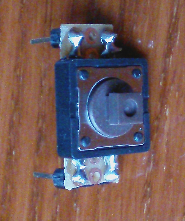 Arra gondolok, hogy készítek neki egy pici NYÁK-ot. Erre fölforrasztom a nyomógombot, s még négy tüskét, melyek csatlakoznak a nyomógomb négy lábához.