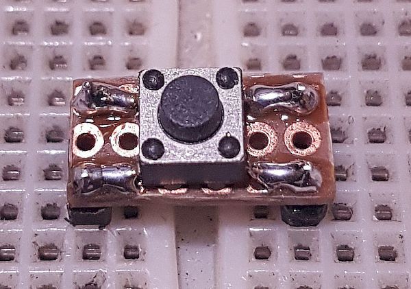 Arra gondolok, hogy készítek neki egy pici NYÁK-ot. Erre fölforrasztom a nyomógombot, s még négy tüskét, melyek csatlakoznak a nyomógomb négy lábához.