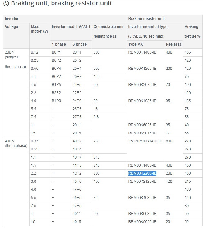 Megnéztem a frekvenciaváltó adatlapján, hogy milyen ellenállás csatlakoztatható hozzá. Az általad megadott táblázatban lévő ellenállások közül a megjelölt a legnagyobb teljesítményű, ami hozzá csatlakoztatható. Az eggyel nagyobb készülékhez (3kW) ajánlott ellenállás kisebb ellenállású, mint amit a frekvenciaváltó elvisel. Szóval amit megjelöltél, azzal lehetne próbálkozni első nekifutásra.