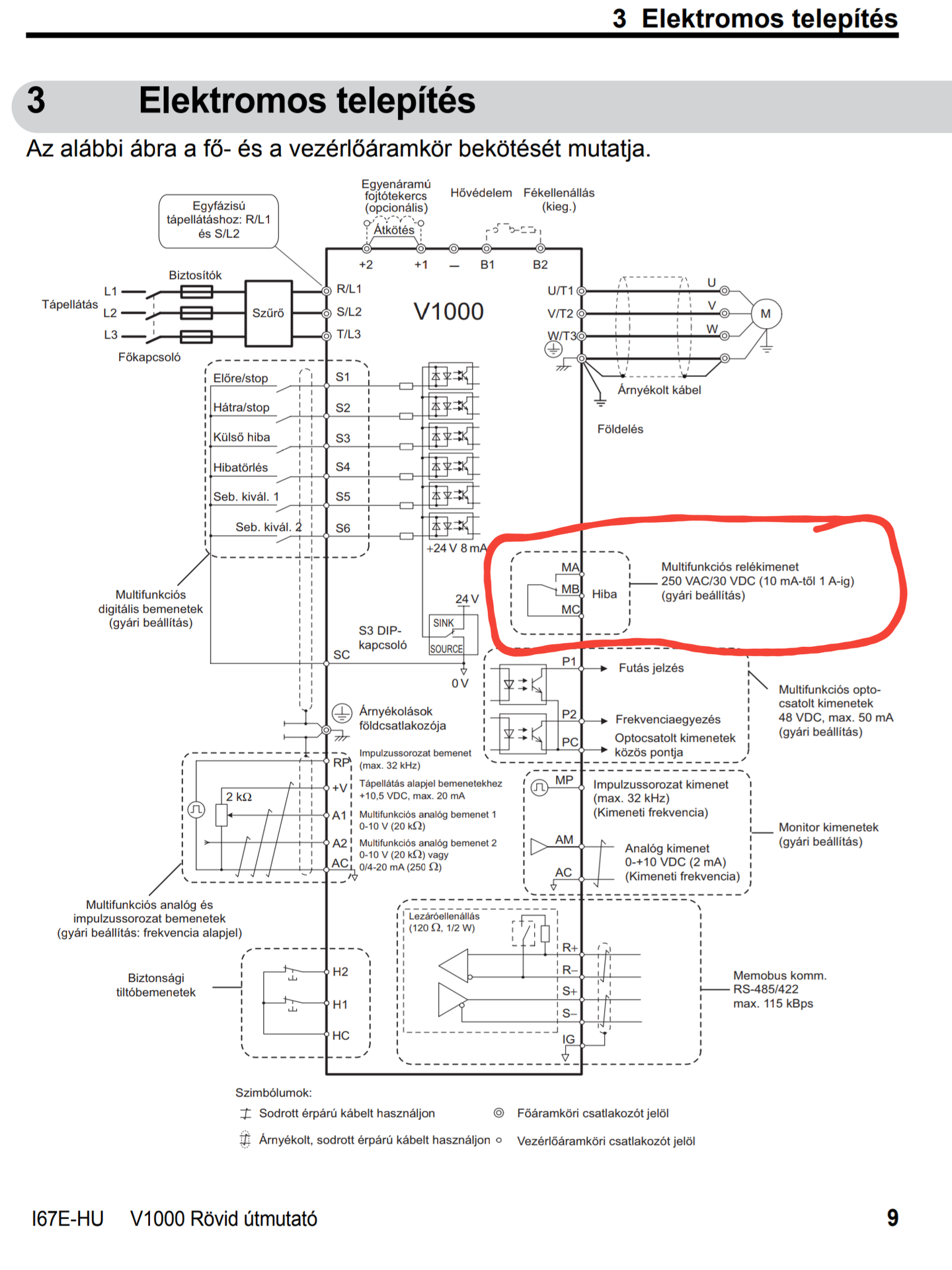 Idézet: „Akkor ennél a váltónál úgy látom nincs egy kimeneti 12 vagy 24V amivel tudnék egy relét működtetni.” A V1000 frekvenciaváltónak három olyan kimenete van ami 12 vagy 24V-os relét tud működtetni: MA/MB/MC, P1, P2