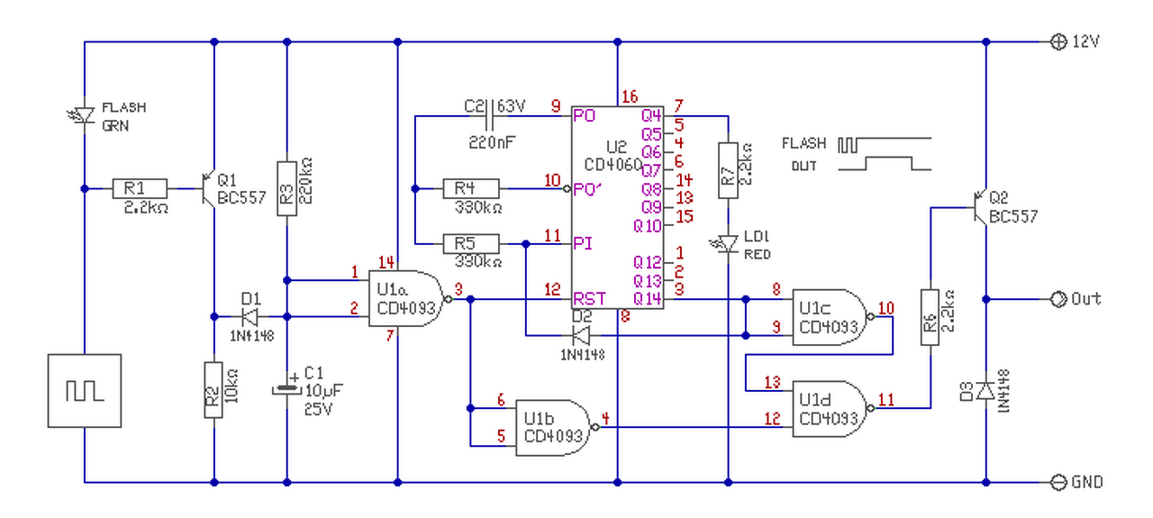- Ha a zöld Led villog, a Q1 is be-ki kapcsolgat. Amikor kikapcsol, az R2 kisüti a D1 segítségével a C1 kondit. - Ha a Led folyamatosan ég, akkor a kollektor magas szinten áll, a dióda lezár, és az R3 feltölti a C1 kondit. (Kb. 2sec). Ekkor az U1a kimenete alacsony szintre vált, és megszűnik U2 Reset jele. A számláló számlálni kezd és ez alatt a piros Led villog. - Mivel U1a kimenete alacsony, U1b kimenete magas. A számláló Q14 kimenete ekkor még alacsony szintű, így az U1c kimenete magas szinten áll. Így U1d mind két bemenete magas szinten áll, Így kimenete alacsony, ami bekapcsolja a tranyót és az OUT kimenete magas szintű lesz. - Ha a számláló "kiszámol", A Q14 magasra vált. A D2 leállítja az ütemadót. Az OUT kimenete alacsony szintre vált. Mind addig ez az állapot áll fenn, míg a zöld Led újra ki nem kapcsol. (Ha a 20 perc késleltetés ideje alatt a zöld kialszik, vagy villog, a kimenet kikapcsol és megszűnik a késleltetés.) a 20 perc időzítés akkor indul újra, ha a zöld Led ismét villogásról fix jelzésre vált.