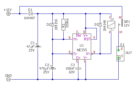 Hello! Ez nem egy abszolút korrekt időzítő, függ a relétől és a tranyó áramerősítésétől, de R1-el értékével beállítható a 3..4 sec.