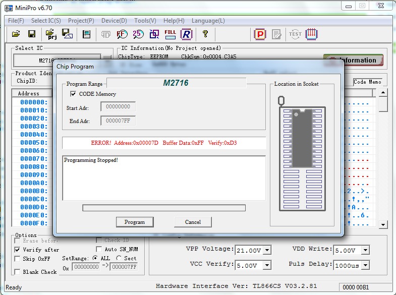 Ez szerintem azért van, mert az égető csak az 0xFF-től eltérő adatokat égeti, mivel egy normálisan törölt EPROM tartalma csupa 0xFF. De nem értem a dolgot, mert a "Skip 0xFF" is ki van kapcsolva, tehát az FF-et is égetnie kellene. Azt meg tudod nézni, hogy az EPROM-ban illetve a bufferben a 0x7d cím elött mik vannak? Azt látom, hogy a 0x7d címen a buferben 0xff, az EPROM-ban meg 0xD3. Arra vagyok kíváncsi, hogy az első 0xff égetésnél akad el, vagy ettől független a probléma.