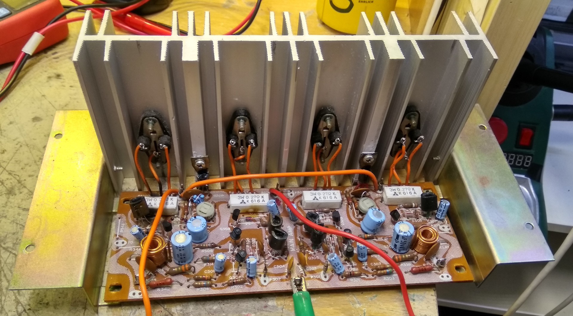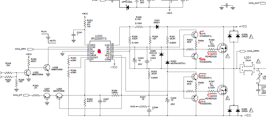 Van egy Crown XLS1000-res erősítőm. A 2-es csatornáján a vég fetek cserére szorultak. Azóta szól, viszont jobban melegszik. Tehát ha nem kötök rá jelet csak bekapcsolom, akkor 10-12 fok különbség van a két oldal között. A pirossal jelölt alkatrészek cserélve lettek. A Q210 Q211 bázisán a földhöz képest kétszer akkora a feszültség. Mi okozhatja ezt szerintetek? Előre is köszönöm!