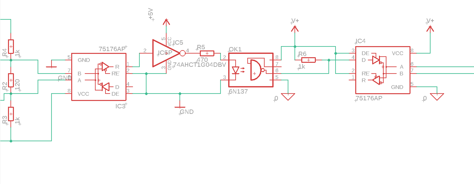 RS485 vonal leválasztásához készítettem egy kapcsolást. Az optocsatoló invertál ezért került elé egy 74AHCT1G14 IC.