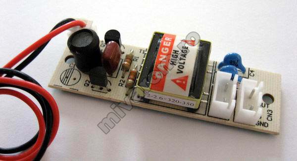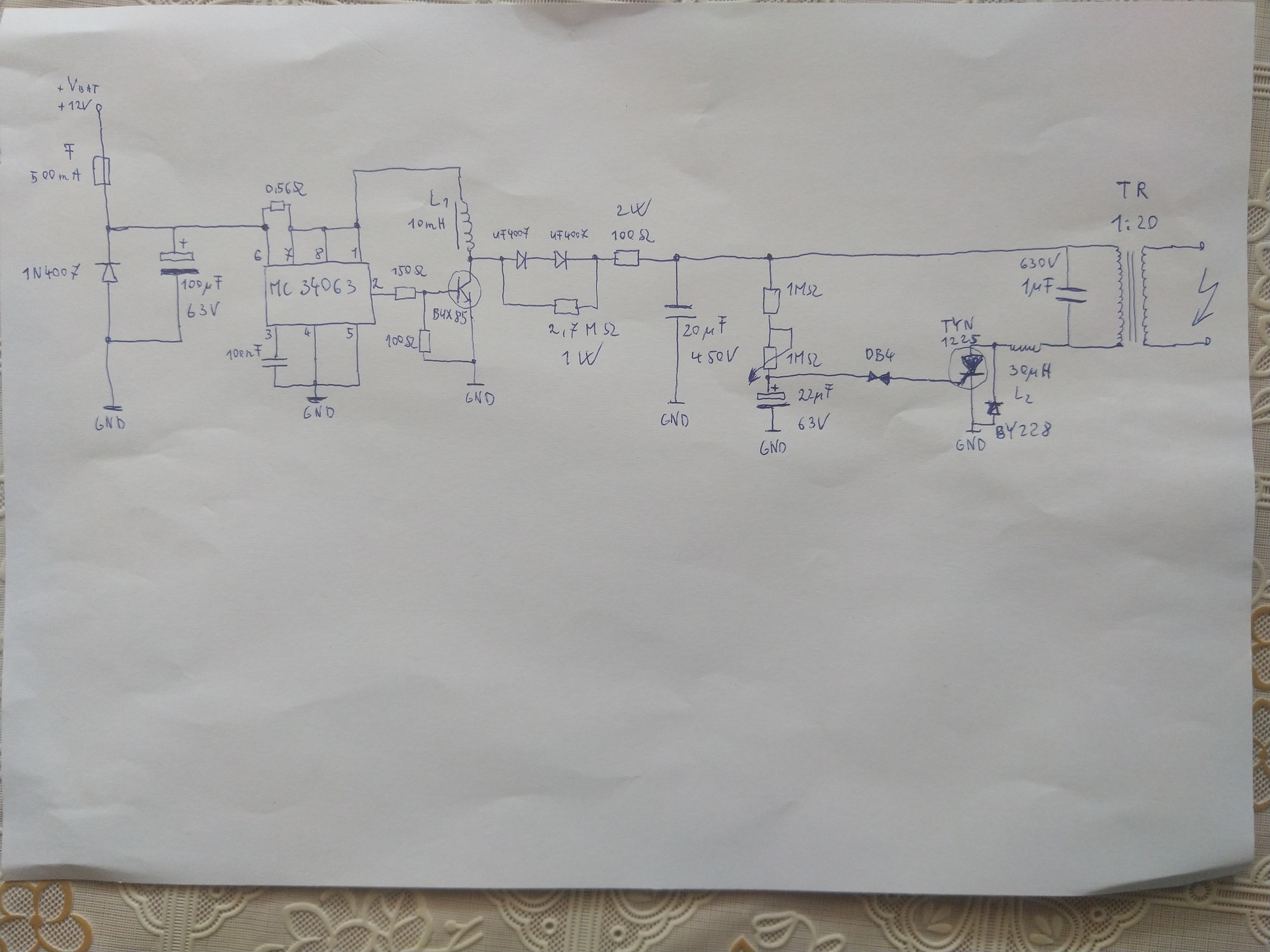 Kb.430-450V-ra tölti az inverter a 20µF-os kondit, és ez kerül a nagyfesztrafó primer oldalára. A kimenetén /szekunder/ kb.9000V van, viszont jóval nagyobbat csattan a szikra mint az autó gyújtó trafóval.A kapcsolás invertere Spectraman tollából származik. Köszönet érte, hogy feltöltötte a topikba ezt a jó inverter kapcsolást.