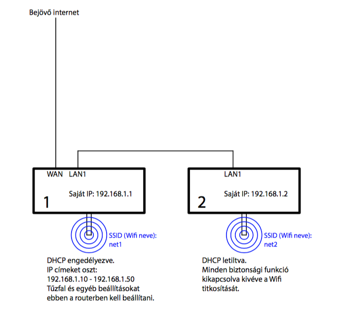 Ezzel a felállással egyetlen apró probléma van. Amikor az eszközök csatlakoznak, akkor oda-vissza lesznek képesek ugrálni a két wifi hálózat között. Célszerűbb AP módba kapcsolni a második routert és minden wifi beállítást az elsővel azonos módon megejteni. Ekkor wifi szempontjából is egyetlen közös hálózatot alkotnak és az eszközök nem fognak köztük ugrálni.