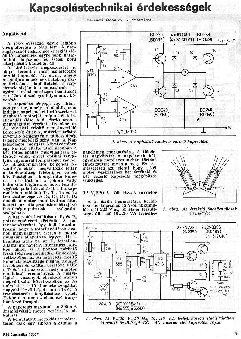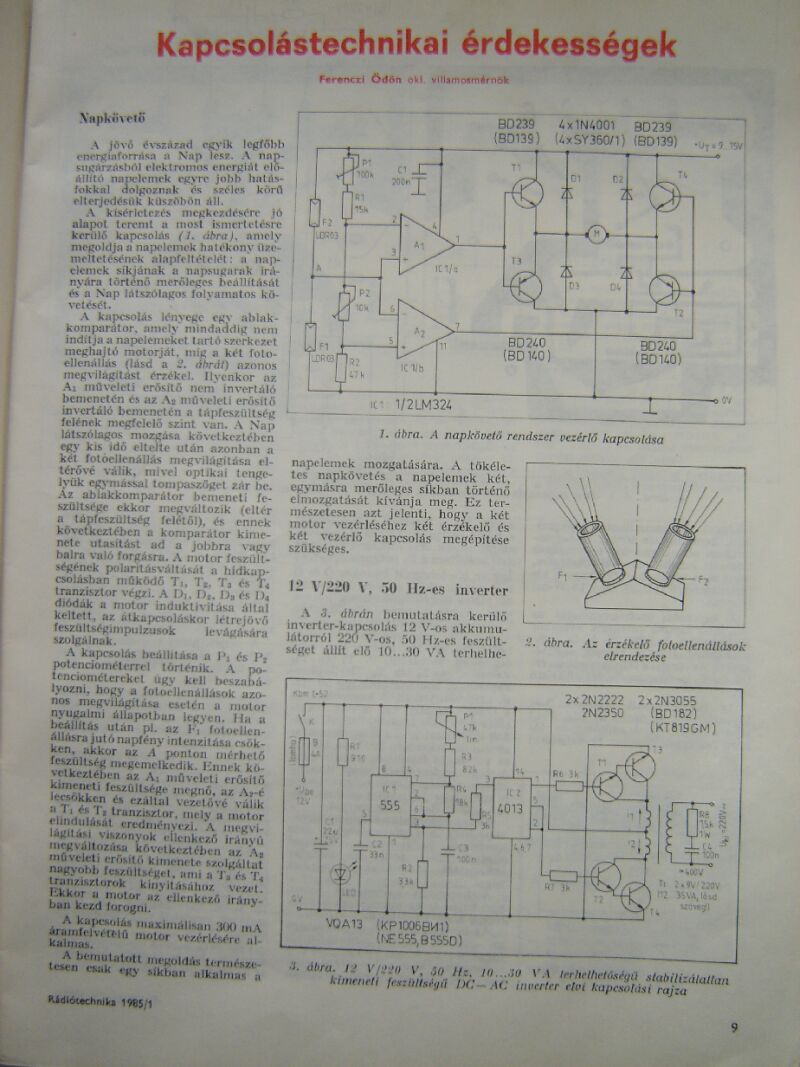 Kedves nonem! Köszőnöm a segítségedet, hogy megkerested a számomra ezt a cikket, ez a naptáblák billentését véglegesen,és megnyugtatóan megoldja. Alkamazni fogom, de az érzékelőket kicserélem valamilyen lusta hőérzékelőre. Az az indoka, hogy a Napelemtáblák hullámzó vizen, hajón vannak, és állandóan menne a Nap keresése, ahogy a hajó billeg -bukdécsol a hullámokon! Szegénv szervó Tengeri Betegséget kapna- fezabálná, amit a Napelem termel. A napra forgatásra van alkalmas Hirschmann Ro 600-as Antenneforgatóm szervoelektronikával 12 V-ra átalakítva. A forgatómotorba van egy 1kOhmos hehyzet poti, a-hídban lévő- párjával lehet kézzel forgatni. Ha ez helyett a Nap állása szerint leosztott feszt. kap a szervóáramkör akkor oda fog beállni ahol a nap áll! Nem keresgélhet, nem foroghat körbe-körbe mert ez nem is tud csak 360 fokot és vissza, mert ez Antennaforgató/kábelek/! A nap állása szerint kaphat majd 8féle feszt. fix osztokból az szerint, hogy hol van a Nap éppen, és ezt az a kapcsolás fogja megállapítani amelyet már itt a Forumban bírálatra feltettem- a 8 hőrzékelőből érkező legnagyobb feszültség alapján. Remélem érethetően foglaltam össze--Tartoztam ennyivel a sok segítségért amit Tőletek 2-3-nap alat ismeretlen újoncként kaptam. Köszönöm mindenkinek, mire ez működni fog addig még bizonyára szükségem lesz a további tanácsaitokra is! Juhász András
