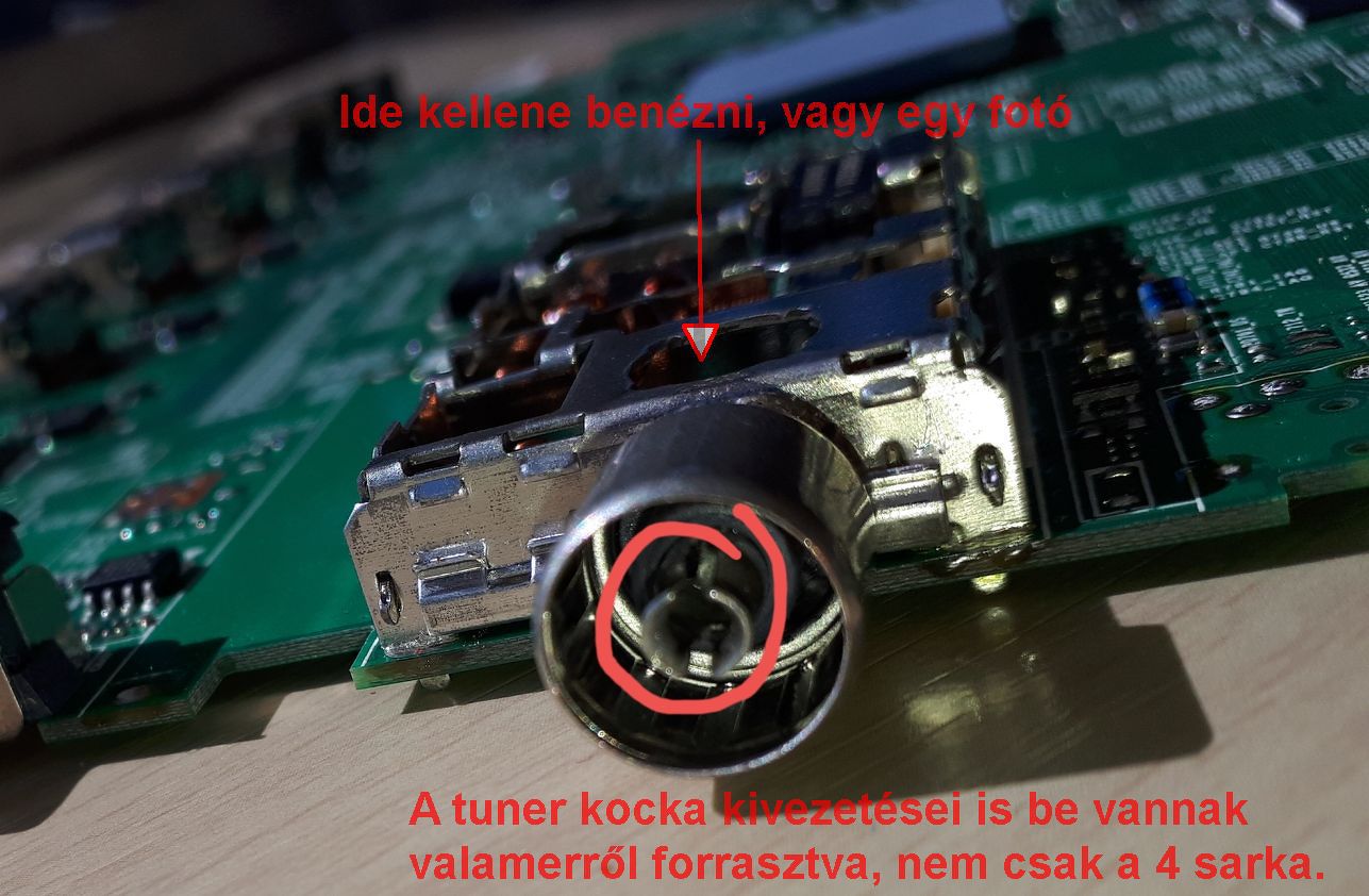 Már összébb nyomtam, nem lett jobb. Már visszaraktam, mert jelenleg ez az egy tv-nk van. Az a baj, hogy érezhetően lóg ha megmozgatom. Sajnos az egész csati egybe van a dobozzal. Legalábbis nekem úgy tűnik. A doboz 4 sarka van beforrasztva a nyákba. Az talán lejön, ha kiszippantom a forrasztást. Lehet hogy magán a dobozon van a csatlakozó és ha kijön a doboz, kijön a csati is?
