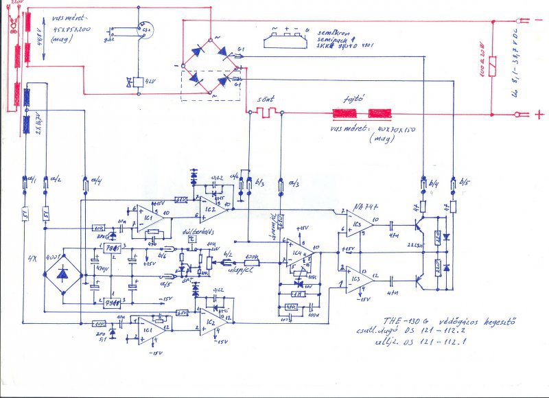 Szeretnék segítséget kérni trafós awi hegesztővel kapcsolatban, mert kifogytam az ötletekből. Az a problémám, hogy kisebb áramokon, kb 30A alatt elkezd lüktetni az ív. Kb 30Hz körüli frekvencián elkezd brummogni és pulzálni. Ha nagyobb ívhosszt tartok akkor mérséklődik/megszűnik a pulzálás. Próbáltam a tápszűrést javítani, műveleti erősítőkre 100nF kondikat tenni, hátha zavarjel okozza, de nem változott. Mit lehetne tenni, van valakinek ötlete? Vagy 1 fázisról nem is lehetséges jobb működést elérni ilyen kis áramon? Nincs tapasztalatom másik géppel. A gép kapcsolása nagyon hasonló a képen láthatóhoz, de ebben már pár apróbb módosítást eszközölt a gyártó. Köszönöm a segítséget! |