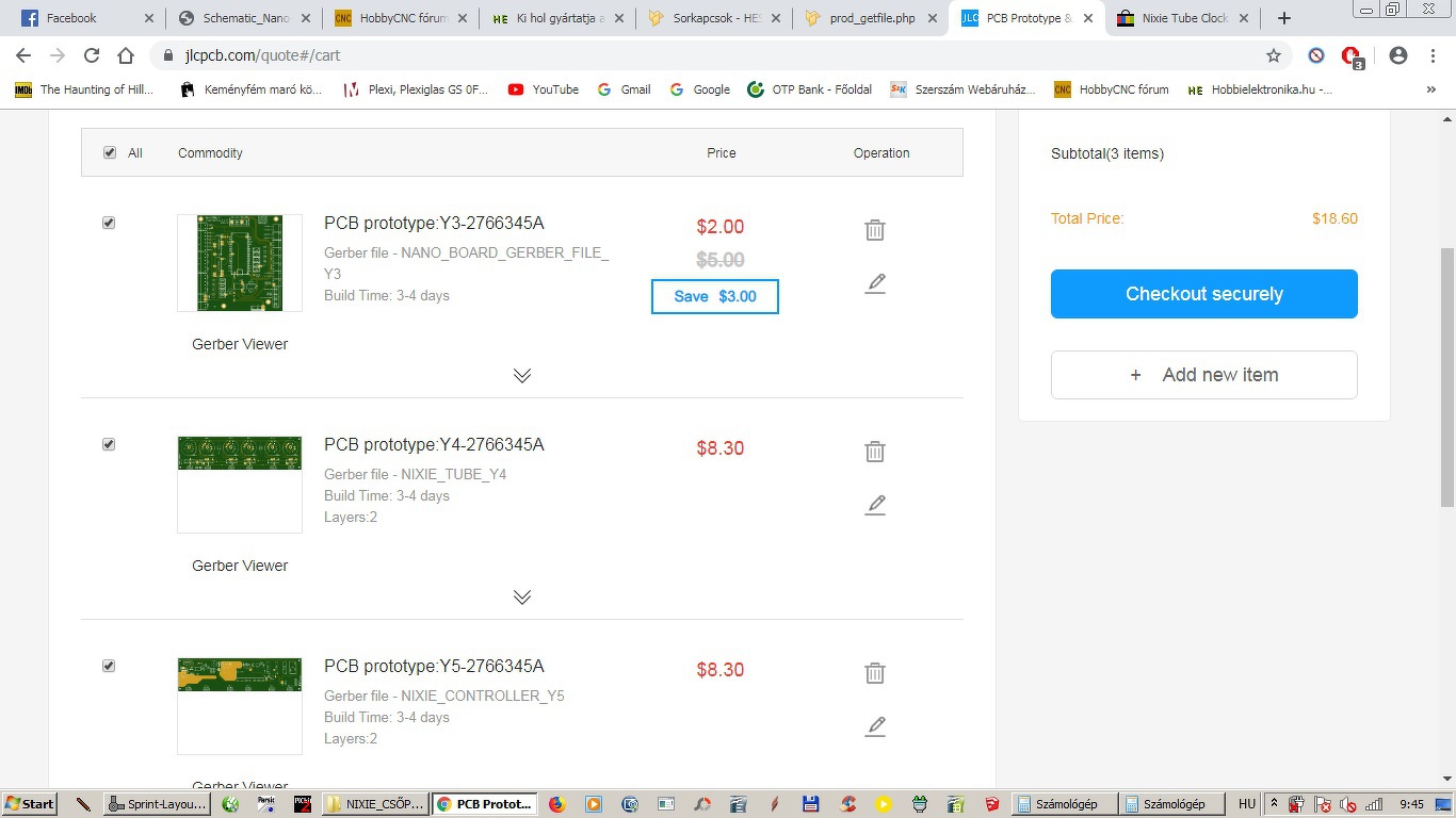 Betettem 3db különböző nyákot a JLCPCB kosárba. Végigvittem a rendelést, de még nem fizettem ki. Létezik, hogy a kb $21 a költség? Gyanúsan olcsó. 10db 220x60mm-es és 5db 90x90mm nyák.